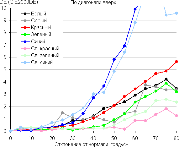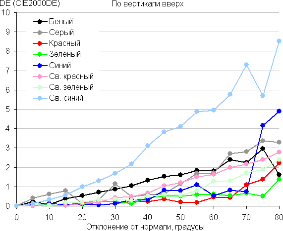 Для количественной характеристики изменения цветопередачи мы провели колориметрические измерения для белого, серого (127, 127, 127), красного, зеленого и синего, а также светло-красного, светло-зеленого и светло-синего полей во весь экран с использованием установки, подобной той, что применялась в предыдущем тесте. Измерения проводились в диапазоне углов от 0° (датчик направлен перпендикулярно к экрану) до 80° с шагом в 5°. Полученные значения интенсивностей были пересчитаны в ΔE относительно замера каждого поля при перпендикулярном положении датчика относительно экрана. Результаты представлены ниже: