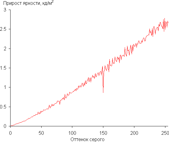 Для оценки характера роста яркости на шкале серого мы измерили яркость 256 оттенков серого (от 0, 0, 0 до 255, 255, 255). График ниже показывает прирост (не абсолютное значение!) яркости между соседними полутонами:
