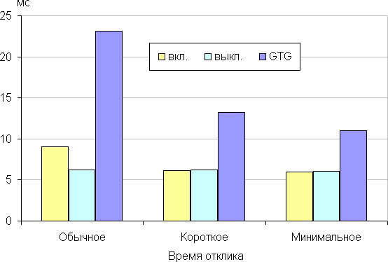 Время отклика зависит от значения одноименной настройки, которая управляет разгоном матрицы. Ступеней регулировки три. Диаграмма ниже показывает, как меняется время включения и выключения при переходе черный-белый-черный (столбики «вкл.» и «выкл.»), а также среднее суммарное время для переходов между полутонами (столбики GTG):