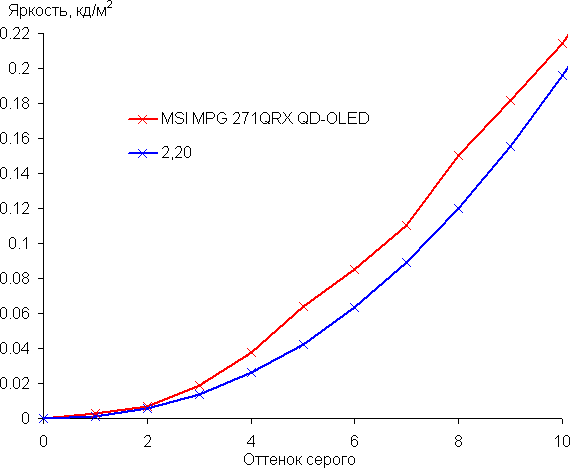 Рост прироста яркости более-менее равномерный, и каждый следующий оттенок значимо ярче предыдущего, даже в самой темной области: