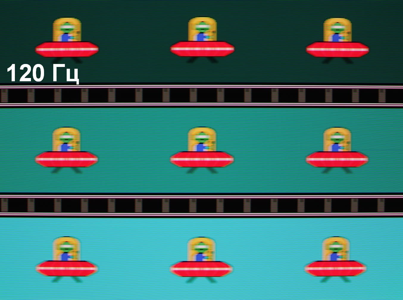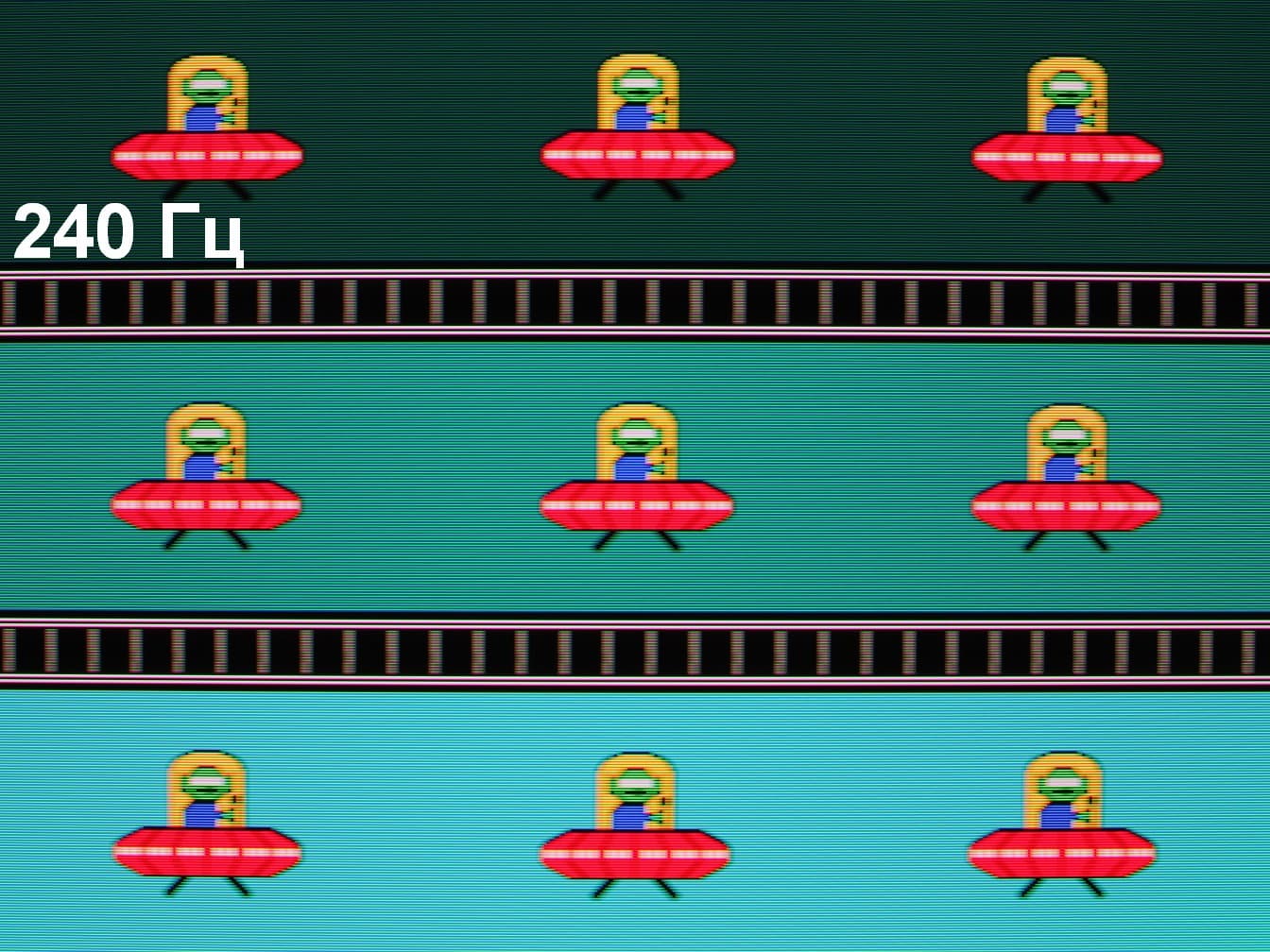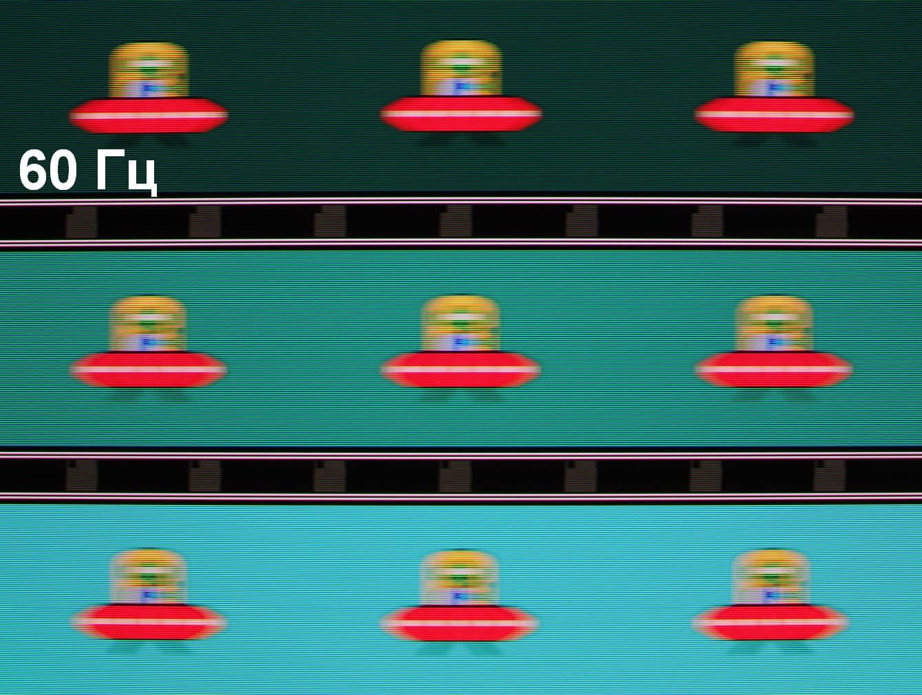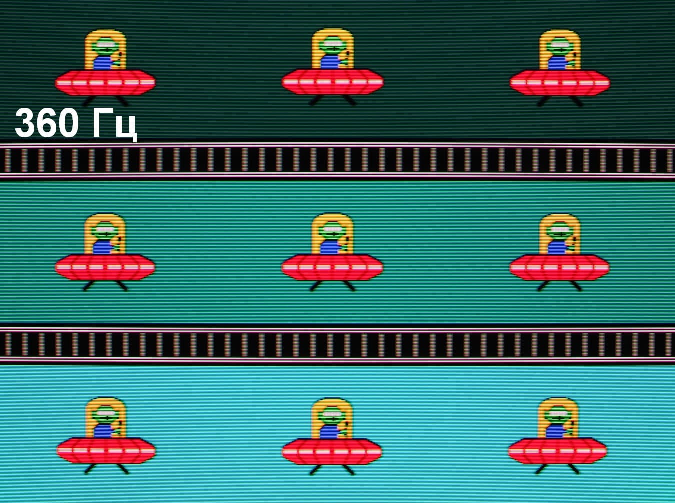 Для наглядного представления о том, что на практике означает такая скорость матрицы приведем серию снимков, полученных с помощью движущейся камеры. Такие снимки показывают, что видит человек, если он следит глазами за двигающимся на экране объектом. Описание теста приведено тут, страница с самим тестом тут. Использовались рекомендованные установки (скорость движения 960 пиксель/с для частот 60, 120 и 240 Гц и 1080 пиксель/с для 360 Гц), выдержка 1/15 с. На фотографиях указаны значения частоты обновления: