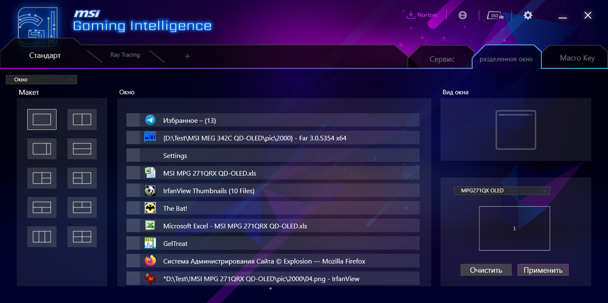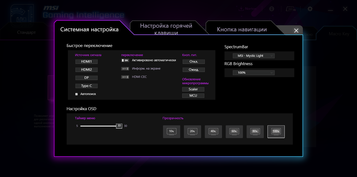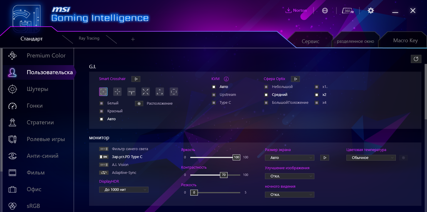 На сайте производителя в разделе поддержки для этого монитора мы обнаружили ссылки на драйвер, на список характеристик в виде файла PDF и на ПО Gaming Intelligence, с помощью которого монитором можно управлять с ПК (нужно подключение к порту USB-B на мониторе). Кроме настроек, доступных из меню монитора, в Gaming Intelligence можно сохранять/загружать профили, управлять распределением окон на рабочем столе, изменять ряд системных настроек, задавать функцию, выполняемую при нажатии на макро-кнопку, устанавливать клавиатурные сокращения для оперативного изменения ряда настроек монитора, и вызывать утилиту Mystic Light, предназначенную для настройки декоративной подсветки на задней панели монитора.