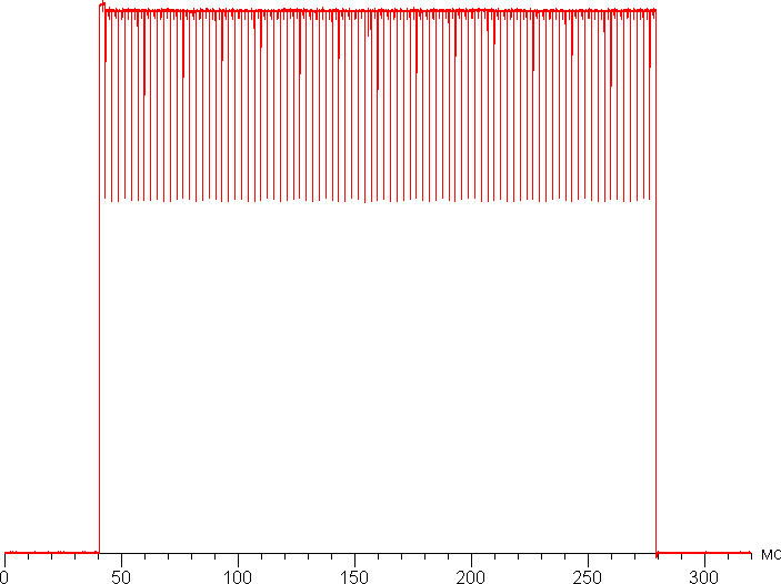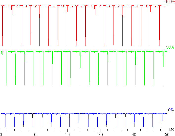 На любом уровне яркости видимое мерцание отсутствует, его не выявляет и тест на стробоскопический эффект. Регистрация зависимости яркости от времени при различных уровнях яркости выявила модуляцию яркости с очень высоким коэффициентом заполнения, что и объясняет отсутствие мерцания. В доказательство приведем графики зависимости яркости (вертикальная ось) от времени (горизонтальная ось) при различных значениях настройки Яркость в случае белого поля на 10% от площади экрана.