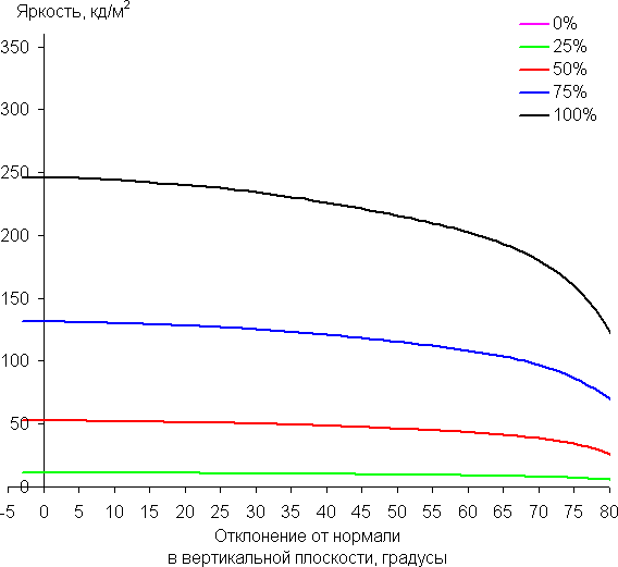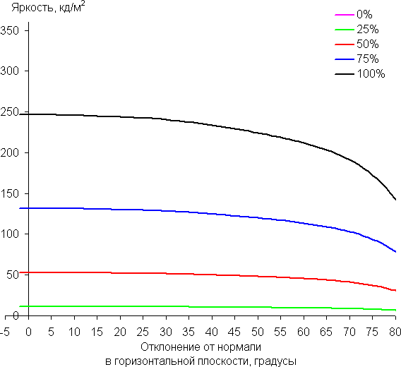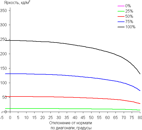 Снижение яркости на 50% от максимального значения достигается только при более чем 80 градусах отклонения. Для сравнения: в случае типичного ЖК-монитора на матрице VA яркость падает вдвое уже примерно при 35°.