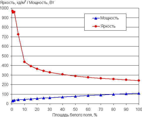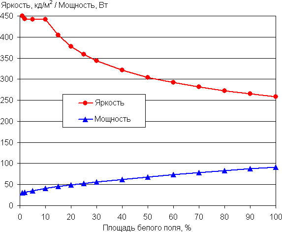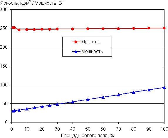 С изменением площади белого максимальная яркость также может меняться, при этом характер зависимости яркости от площади белого участка зависит как минимум от текущего режима — SDR или HDR. В случае HDR пользователь дополнительно может выбирать в настройках монитора между вариантами True Black 400 и До 1000 нит. Например, в случае сигнала SDR яркость от 1% до 100% площади белого сохраняется на уровне порядка 250 кд/м² (дополнительно по вертикальной оси отложена потребляемая мощность):