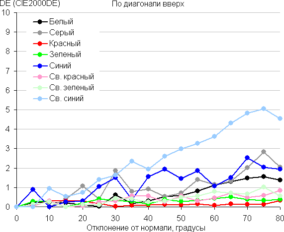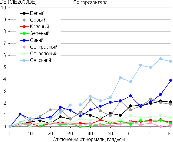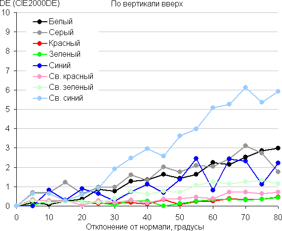 Для количественной характеристики изменения цветопередачи мы провели колориметрические измерения для белого, серого (127, 127, 127), красного, зеленого и синего, а также светло-красного, светло-зеленого и светло-синего полей во весь экран с использованием установки, подобной той, что применялась в предыдущем тесте. Измерения проводились в диапазоне углов от 0° (датчик направлен перпендикулярно к экрану) до 80° с шагом в 5°. Полученные значения интенсивностей были пересчитаны в отклонение ΔE относительно замера каждого поля при перпендикулярном положении датчика относительно экрана. Результаты представлены ниже:
