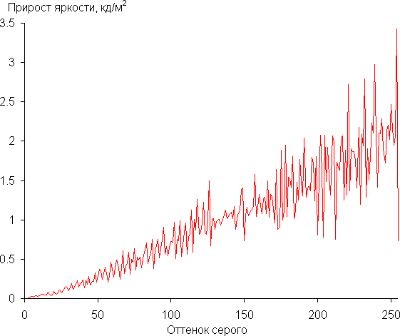 Для оценки характера роста яркости на шкале серого мы измерили яркость 256 оттенков серого (от 0, 0, 0 до 255, 255, 255). График ниже показывает прирост (не абсолютное значение!) яркости между соседними полутонами: