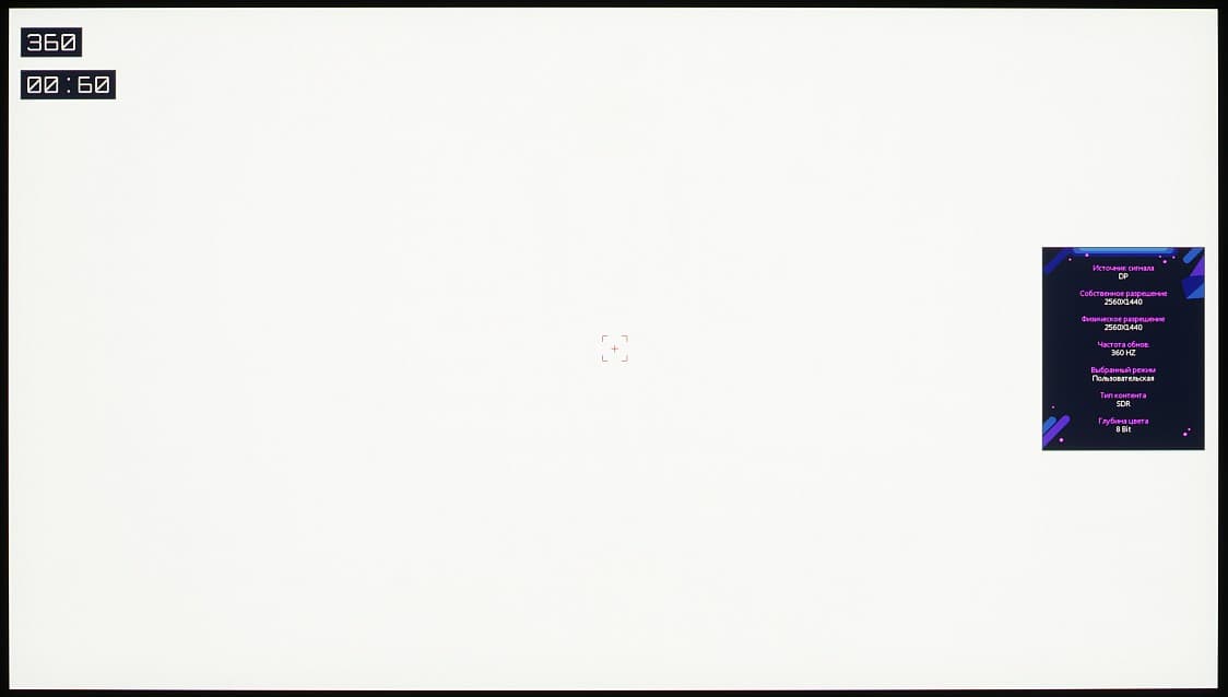 Мы определяли полную задержку вывода от переключения страниц видеобуфера до начала вывода изображения на экран (напомним, что она зависит от особенностей работы ОС Windows и видеокарты, а не только от монитора). Задержка вывода изображения при 360 Гц равна 3 мс. Это очень низкое значение задержки, она абсолютно не ощущается при работе за ПК и даже в самых динамичных играх не приведет к снижению результативности.