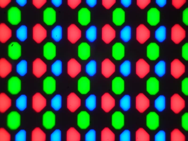 В данном экране используется матрица типа QD-OLED — активная матрица на органических светодиодах. Полноцветное изображение создается с помощью субпикселей трех цветов — красного (R), зеленого (G) и синего (B) в равном количестве — по три разного вида на пиксель. Каждый субпиксель имеет свой независимо управляемый OLED-источник синего света, а красный и зеленый цвета формируются с помощью светофильтров на квантовых точках (QD — Quantum Dots), размещенных перед этими источниками. Синий субпиксель светофильтра, разумеется, не имеет. Упрощенная схема ниже поясняет устройство QD-OLED: