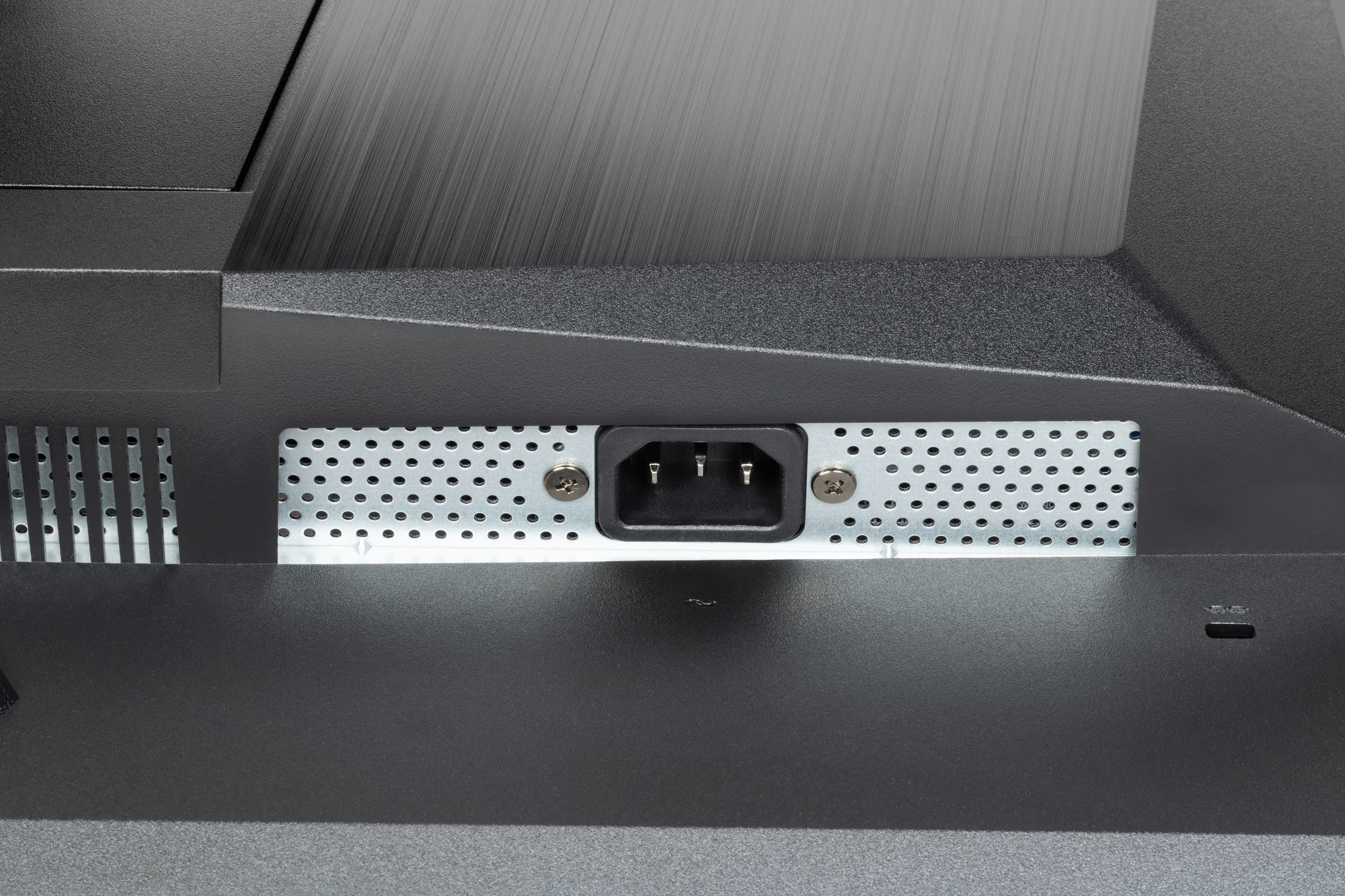 Разъем питания и интерфейсные разъемы размещены на нижнем торце кожуха сзади и ориентированы вниз. Подключать кабели к этим разъемам удобнее при перевороте экрана в портретную ориентацию. Кабели, идущие от этих разъемов, можно пропустить через отверстие в нижней части стойки подставки — так сзади монитор выглядит аккуратнее.
