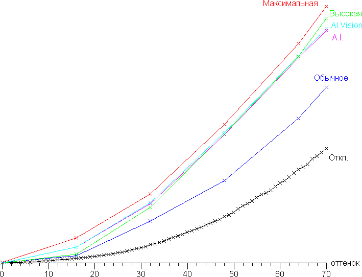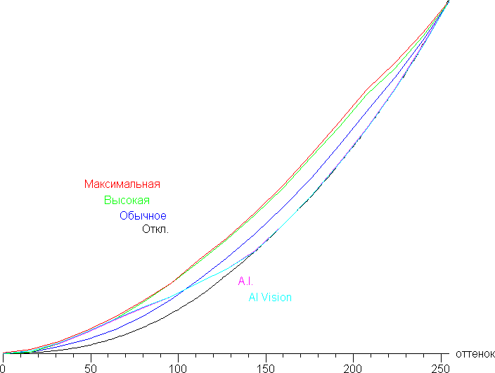 Дополнительной настройкой Night Vision (ночного видения) можно скорректировать гамма-кривую, улучшая различимость деталей в тенях. Это может быть полезно в играх с темными сценами. Ниже приведены гамма-кривые (по 32 точкам) при четырех значениях этой настройки и когда эта функция отключена, а также при включении функции AI Vision: