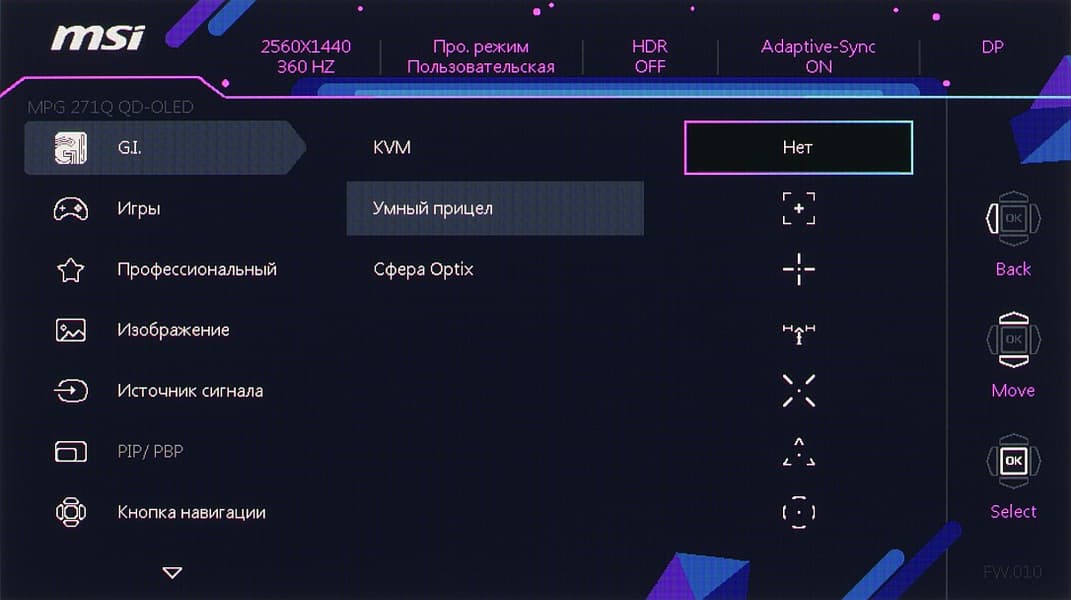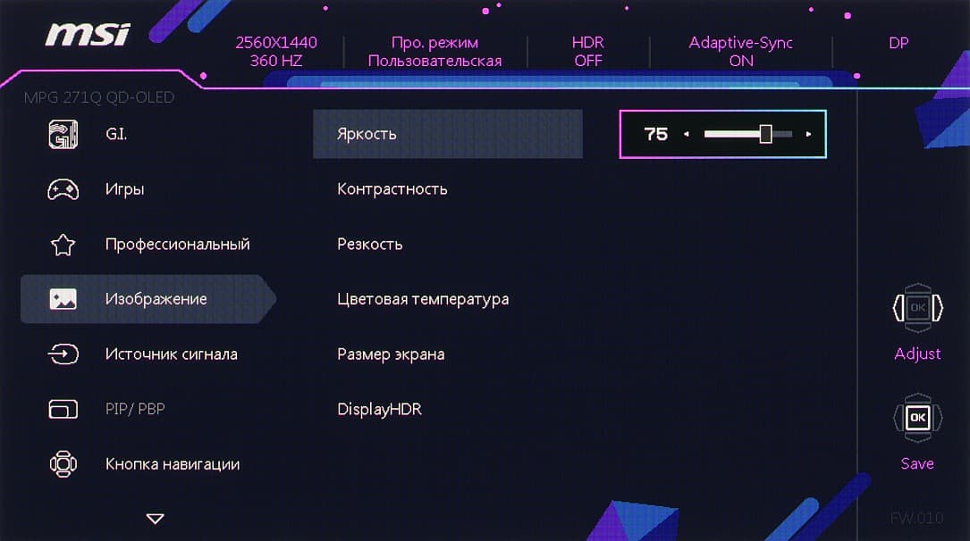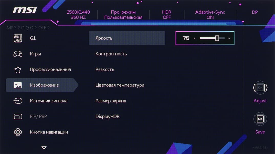 Настроек, влияющих на яркостный и цветовой баланс, не очень много, что для игрового монитора ожидаемо. Можно выбрать один из пяти предустановленных профилей с заданными «игровыми» настройками и одновременно с этим один из семи «профессиональными» настройками изображения. В обоих списках профилей есть еще по одному пользовательскому профилю. Все профили являются редактируемыми, но в ряде профилей ряд настроек могут быть недоступными.