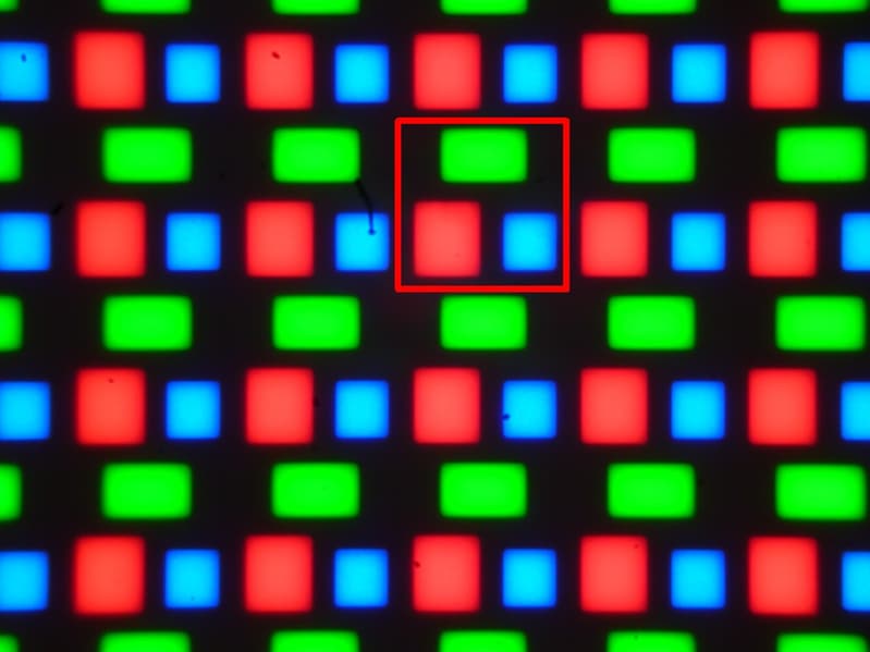 Красный квадрат очерчивает один пиксель. Отметим, что в случае монитора MSI MEG 342C QD-OLED, форма и расположение субпикселей другие: