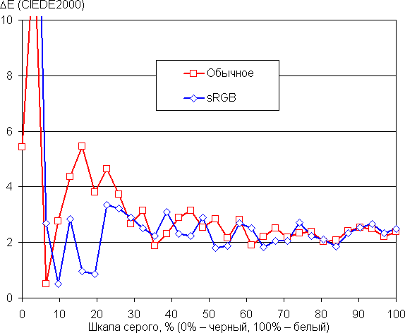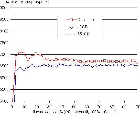 Графики ниже показывают цветовую температуру на различных участках шкалы серого и отклонение от спектра абсолютно черного тела (параметр ΔE) в случае настроек по умолчанию (подписано — Обычное) и при выборе профиля sRGB (sRGB) также без дополнительной коррекции (которая, впрочем, и так невозможна):