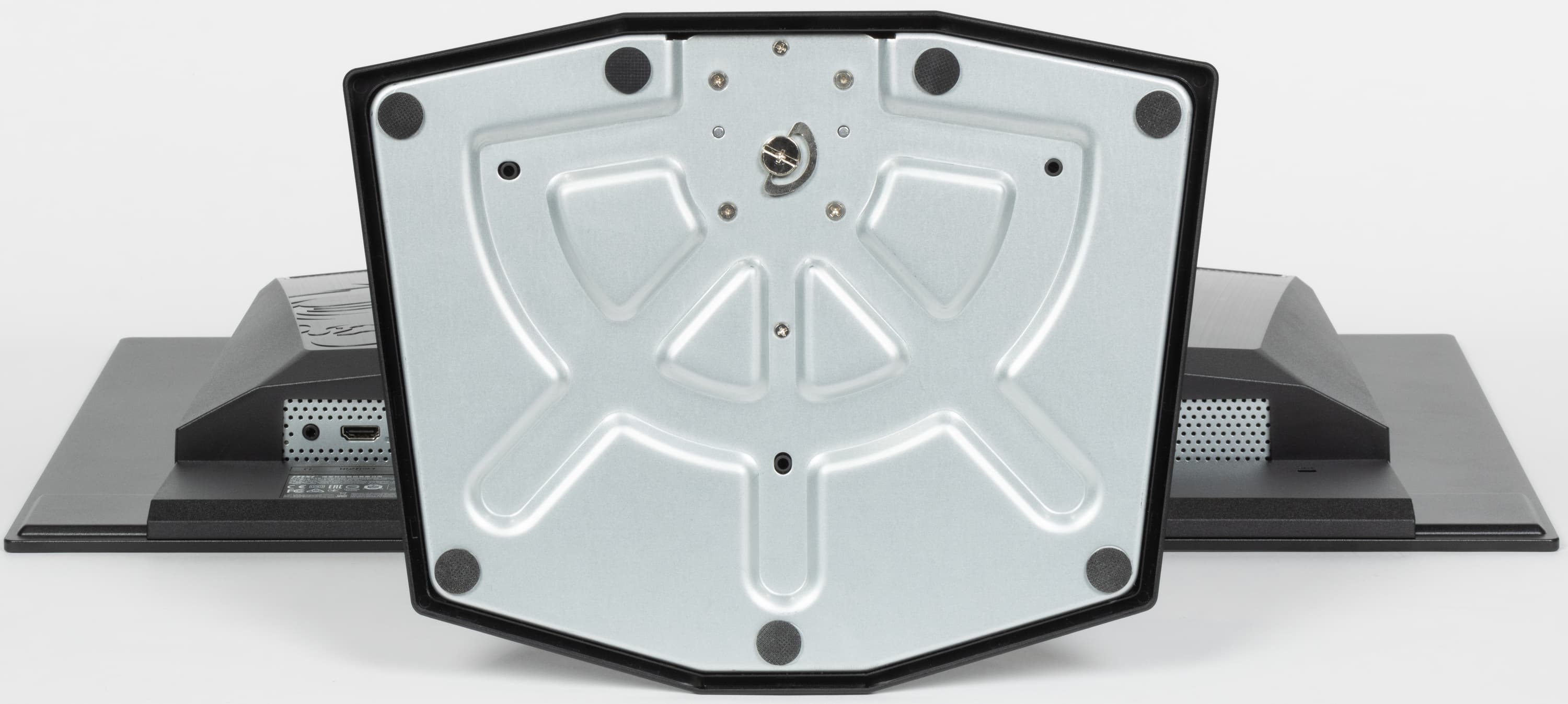 Чтобы выдержать вес монитора, несущие детали подставки изготовлены из алюминиевого сплава и стали. На штатной подставке монитор стоит устойчиво. Конструкция подставки достаточно жесткая. Накладки из упругого пластика снизу на основании подставки защищают поверхность стола от царапин и предотвращают скольжение монитора на гладких поверхностях.