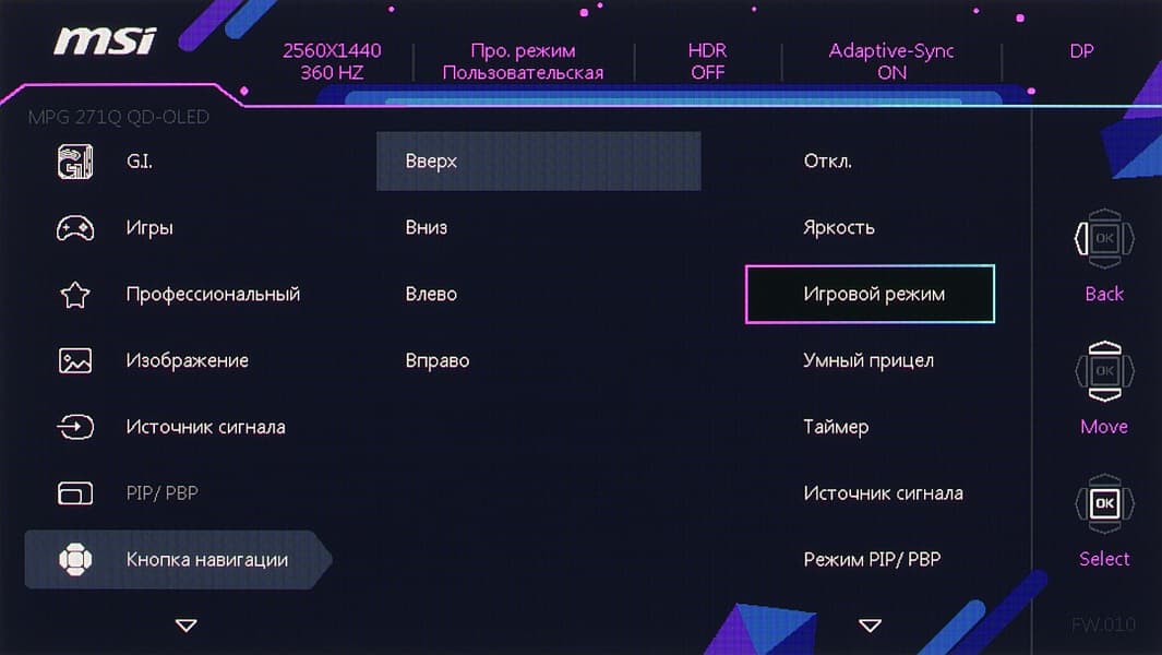 Индикатор питания неярко светится белым при работе (можно отключить), оранжевым — в режиме ожидания, и не горит, если монитор условно выключен. Если монитор работает, и на экране нет меню, то при отклонении джойстика вниз/вверх или вправо/влево на экран выводится та настройка, которая назначена на данное отклонение.