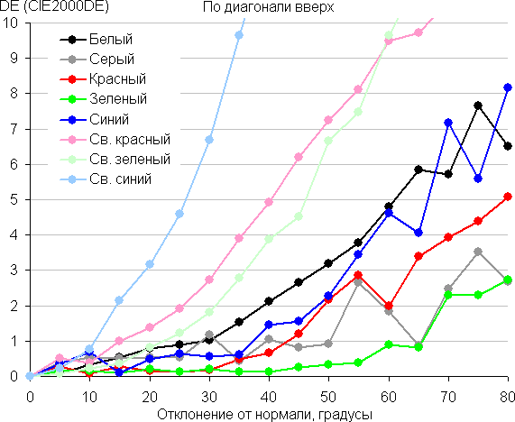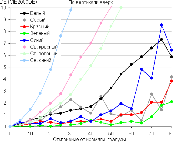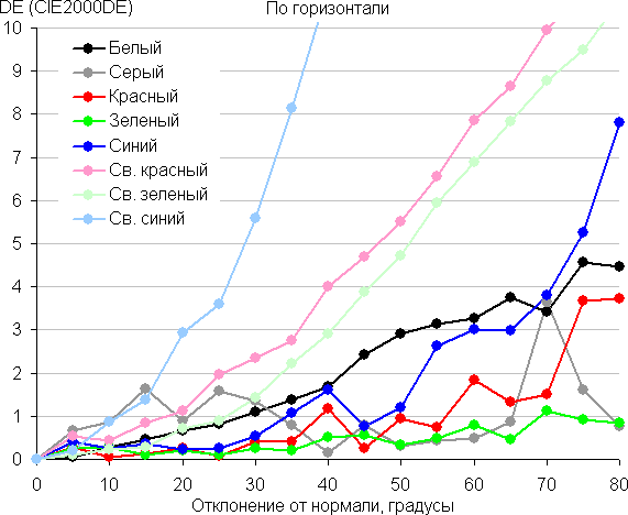 Для количественной характеристики изменения цветопередачи мы провели колориметрические измерения для белого, серого (127, 127, 127), красного, зеленого и синего, а также светло-красного, светло-зеленого и светло-синего полей во весь экран с использованием установки, подобной той, что применялась в предыдущем тесте. Измерения проводились в диапазоне углов от 0° (датчик направлен перпендикулярно к экрану) до 80° с шагом в 5°. Полученные значения интенсивностей были пересчитаны в ΔE относительно замера каждого поля при перпендикулярном положении датчика относительно экрана. Результаты представлены ниже: