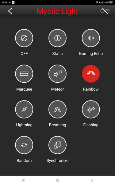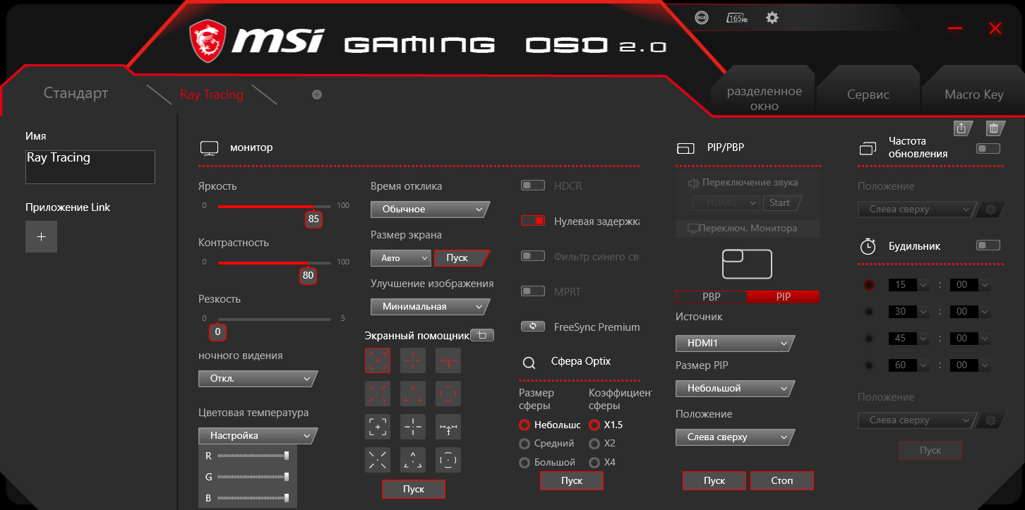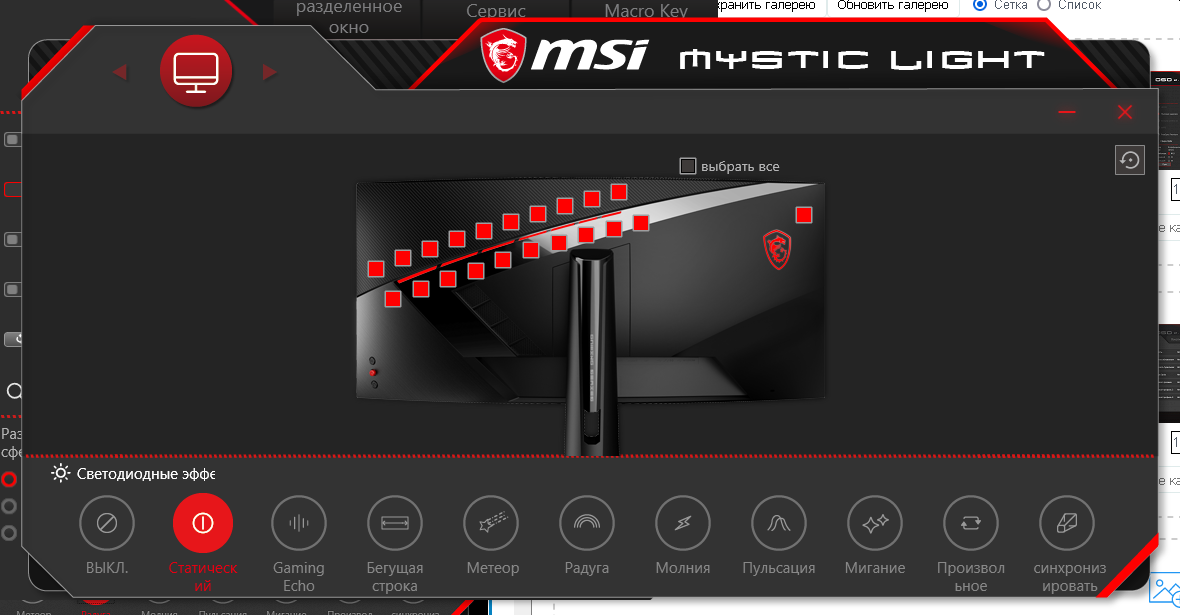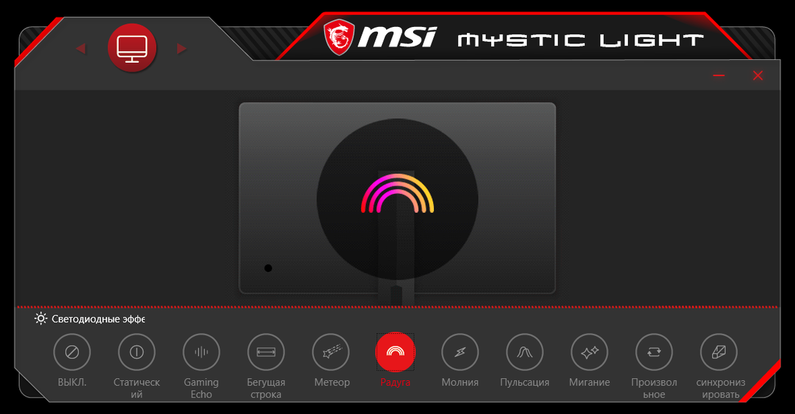 В меню монитора подсветку можно включить (динамичный режим) или выключить. Больше вариантов работы подсветки доступно, если воспользоваться утилитой Mystic Light, которая запускается из программы Gaming OSD.