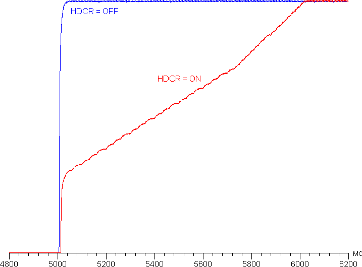 При включении режима с динамическим управлением яркости установившаяся контрастность формально возрастает до бесконечности, так как на черном поле во весь экран подсветка выключается совсем через 10 секунд. Впрочем, уже курсора мыши достаточно для включения подсветки. График ниже показывает, как увеличивается яркость (вертикальная ось) при переключении с черного поля (после пяти секунд вывода) на белое при выключенной и включенной динамической подстройке яркости: