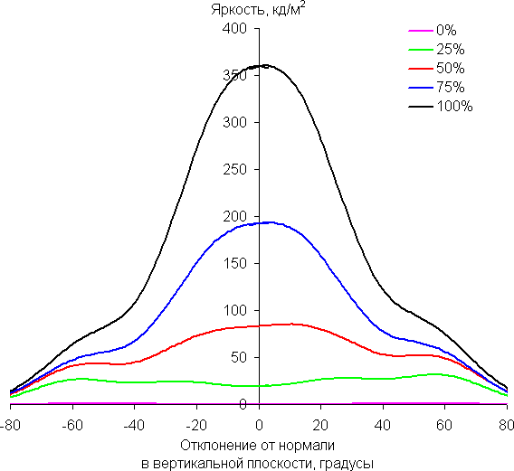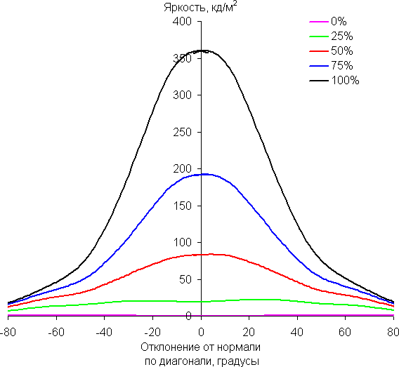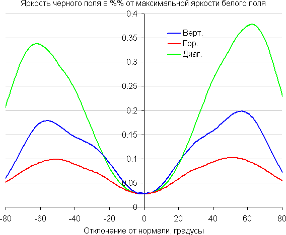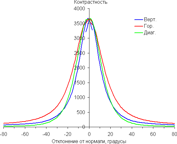 По скорости падения яркости углы обзора неширокие. Отметим примерно одинаковый характер уменьшения яркости при отклонении от перпендикуляра к экрану во всех трех направлениях, при этом графики не пересекаются в значимом диапазоне измеряемых углов. При отклонении в диагональном направлении яркость черного поля достигает большего значения, чем в двух других случаях. Однако максимум яркости черного поля все равно гораздо меньше, чем в случае типичного монитора на матрице IPS. Контрастность в диапазоне углов ±82° остается существенно выше значения 10:1.