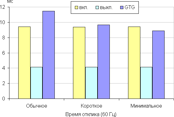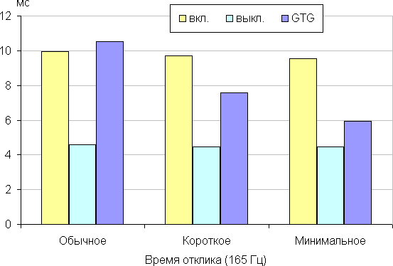 Время отклика зависит от значения одноименной настройки, которая управляет разгоном матрицы. График ниже показывает, как меняется время включения и выключения при переходе черный-белый-черный (столбики «вкл.» и «выкл.»), а также среднее суммарное время для переходов между полутонами (столбики «GTG») для трех значений этой настройки при частоте обновления 165 Гц:
