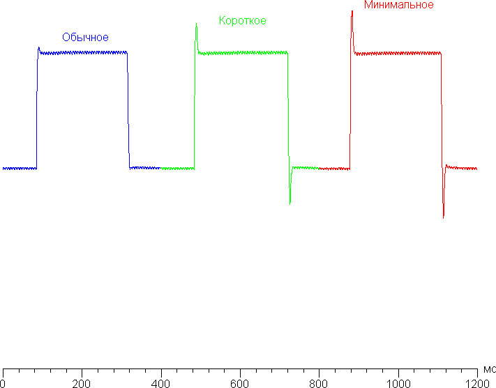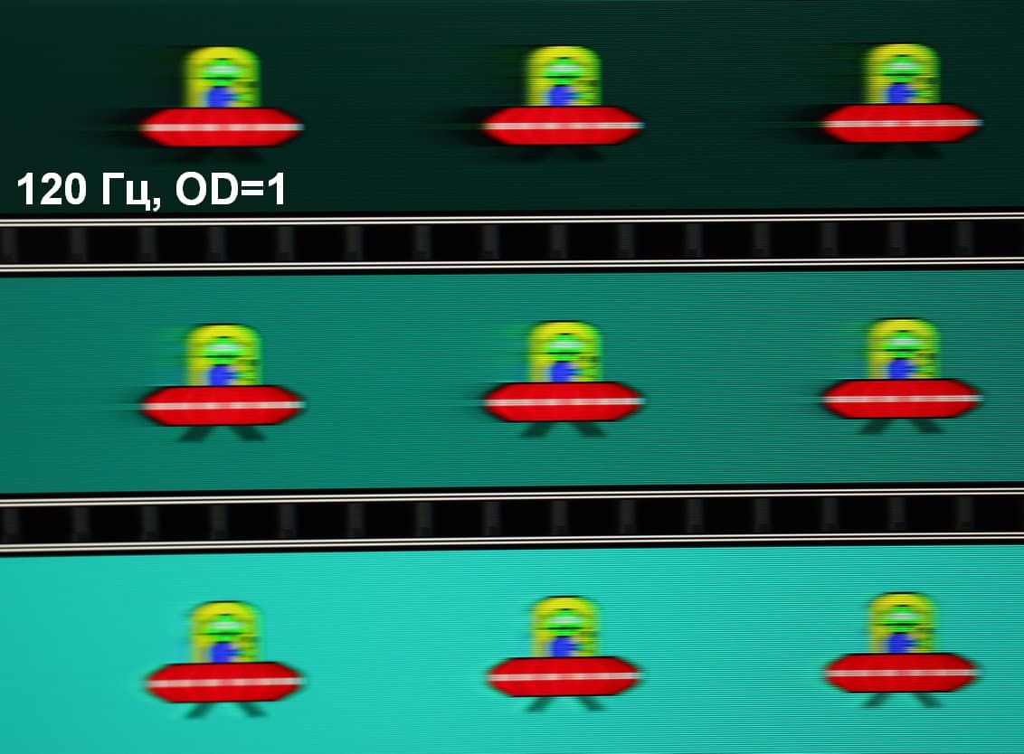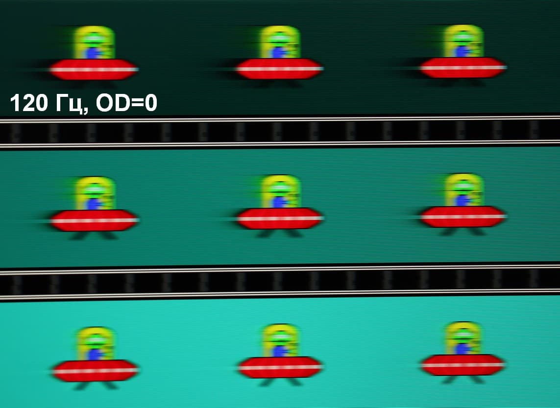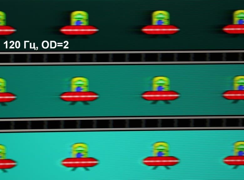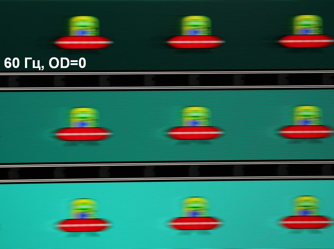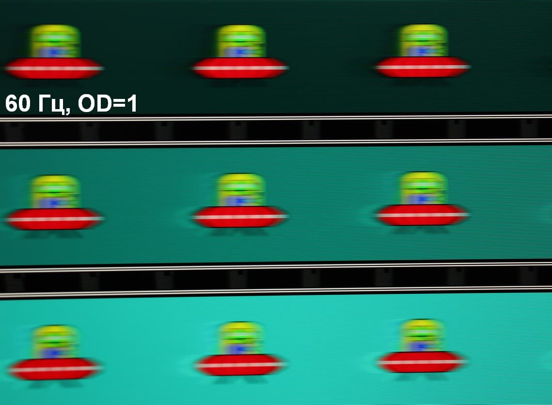 Визуально даже в случае сильного разгона (последняя ступень) видимых артефактов немного. Однако при 60 Гц заметность артефактов может быть выше Например, при переходе от светлых тонов к темным провал вниз длится дольше, то есть темный след за светлым объектом в движении длиннее и заметнее: