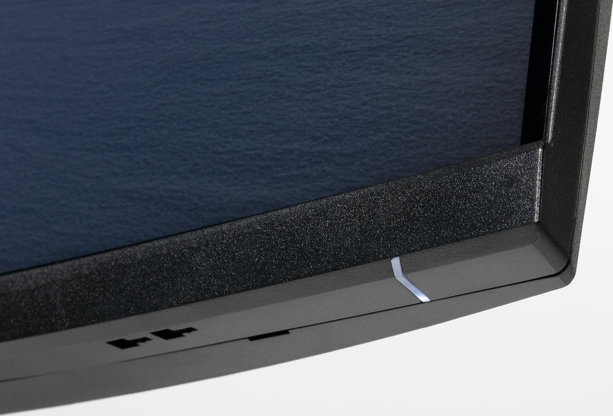 Нижняя кнопка выключает монитор или переводит его в странный (индикатор не горит, потребление примерно 8 Вт) режим ожидания, что именно — указывает пользователь в настройках. Внизу и ближе к правому краю на стыке нижнего торца и фронтальной планки есть белый светорассеиватель индикатора состояния.
