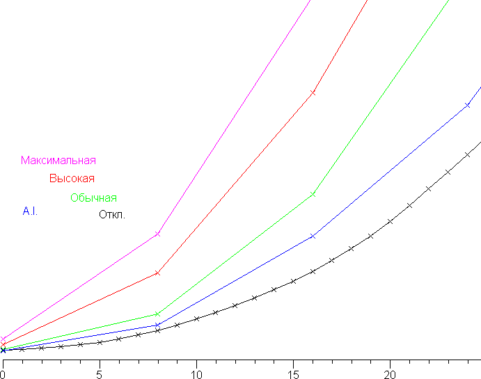 Дополнительной настройкой Система ночного видения (три уровня плюс автоматический) можно скорректировать гамма-кривую, улучшая различимость деталей в тенях. Это может быть полезно в играх с темными сценами. Ниже приведены гамма-кривые (построенные по 33 точкам) при четырех значениях этой настройки и когда эта функция отключена: