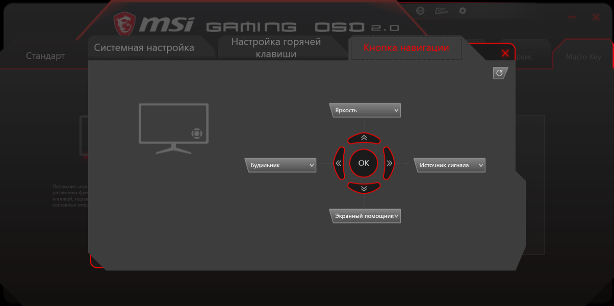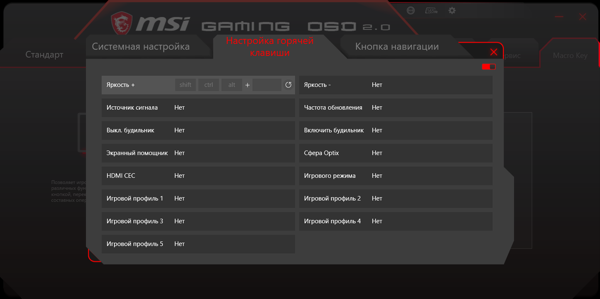 Верхняя кнопка работает совместно с программой Gaming OSD и по умолчанию нажатие на кнопку просто вызывает эту программу (если она была установлена), но можно назначить и другое действие, выбрав его в списке: