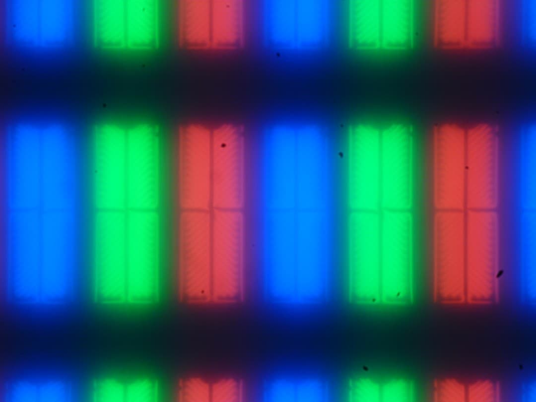 Четкое изображение структуры пикселей из-за матовой поверхности получить не удается, впрочем, на фрагменте ниже можно разглядеть типичную для VA структуру в виде параллельных полосок, а также что каждый субпиксель делится на четыре равных домена, в которых полоски ориентированы под разными углами (черные точки — это пыль на матрице фотоаппарата):