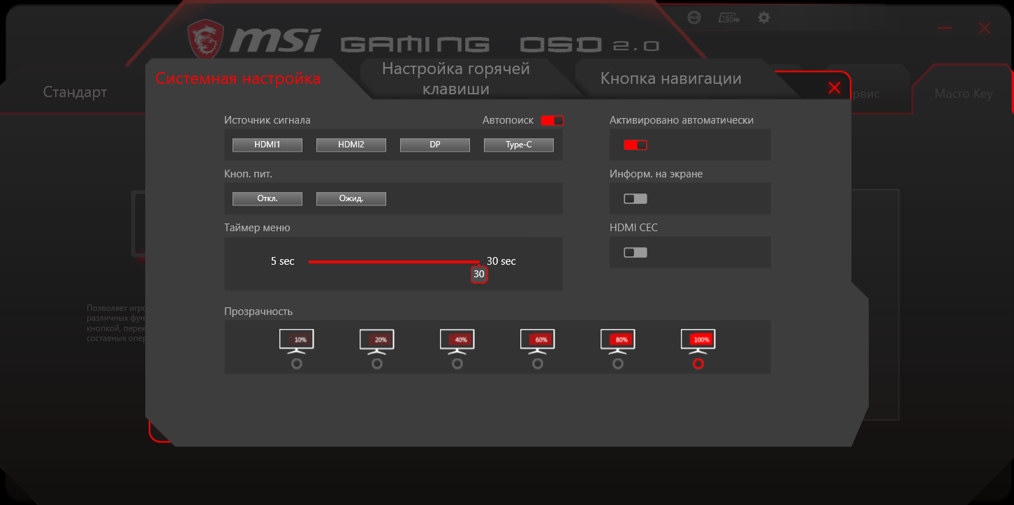 Настраиваются уровень прозрачности фона и задержка автоматического выхода из меню. Присутствует русская версия экранного меню.