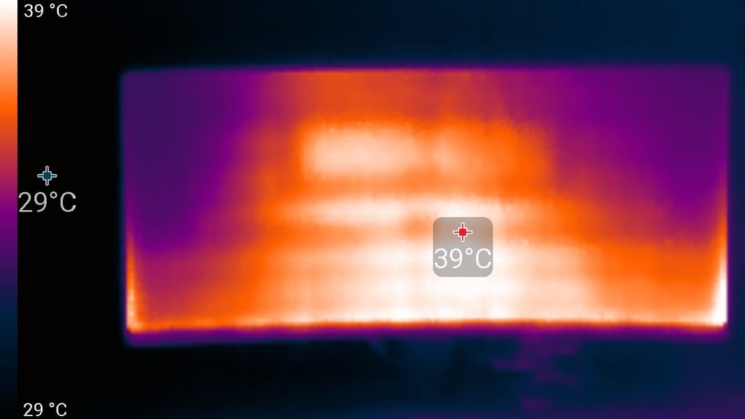 По распределению областей нагрева, можно предположить, что внизу находится светодиодная линейка подсветки экрана. Нагрев сзади умеренный.