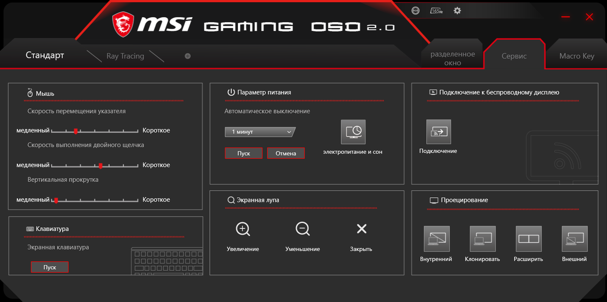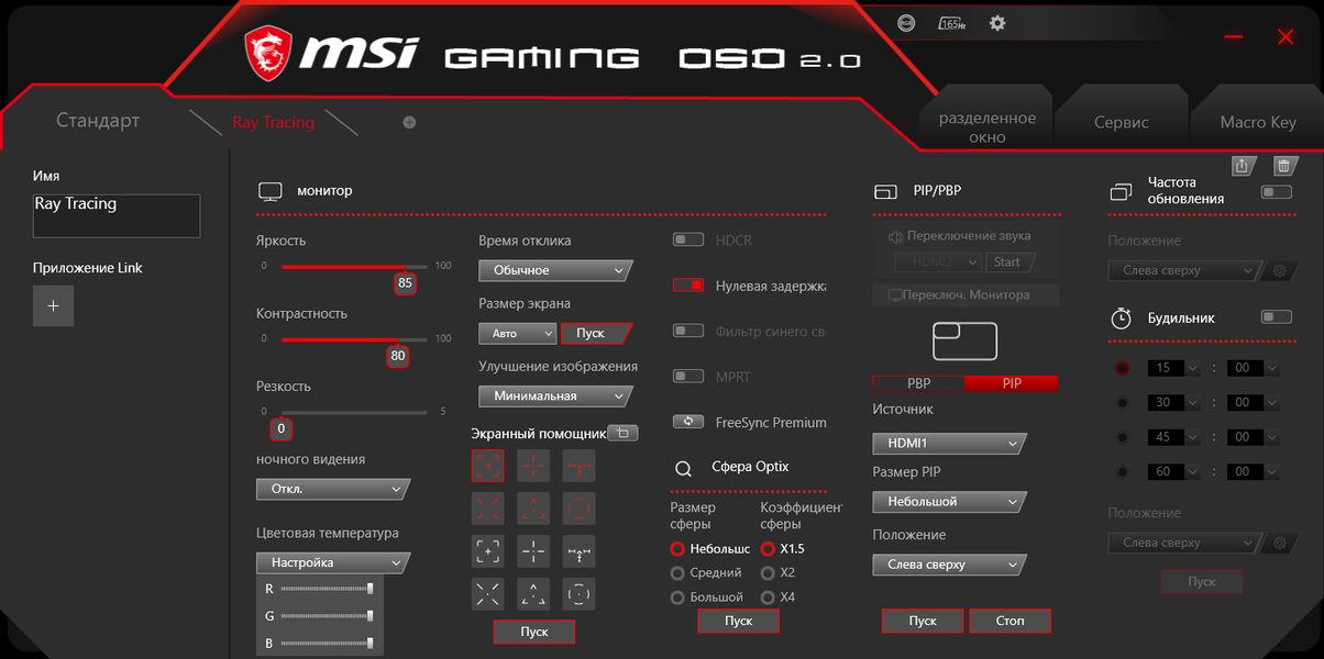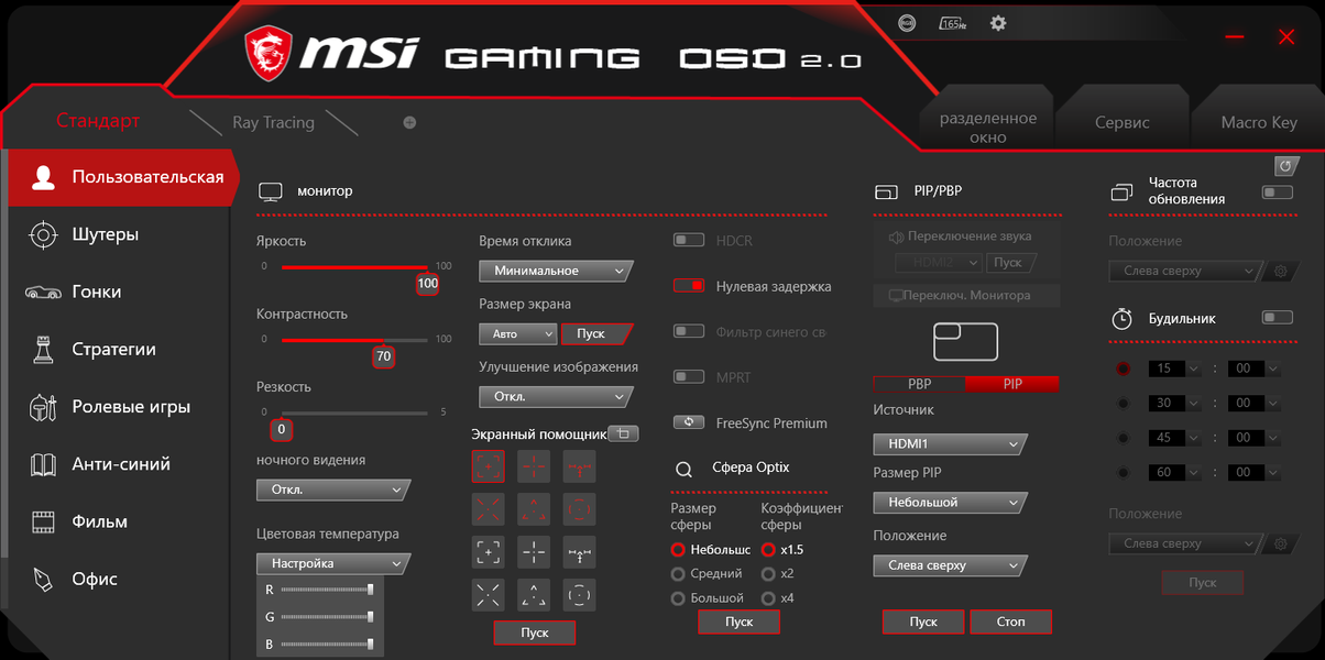 Из дополнительных возможностей присутствуют три «геймерские» функции: вывод на экране счетчика частоты кадров, перекрестия прицела выбранного типа и цвета (красного или белого), настраиваемого таймера с обратным отсчетом. Положение на экране этих элементов можно менять, и выводиться может все одновременно.