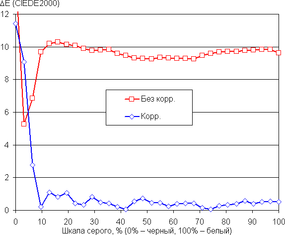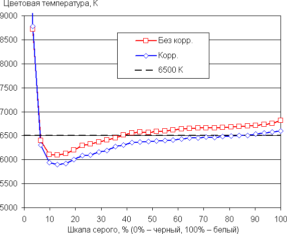 Самый близкий к черному диапазон можно не учитывать, так как в нем цветопередача не так важна, а погрешность измерения цветовых характеристик высокая. Ручная коррекция приблизила цветовую температуру к 6500 К и существенно уменьшила значение ΔE. Впрочем, для игрового применения особой необходимости в коррекции нет.