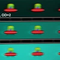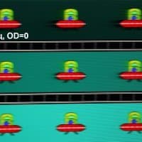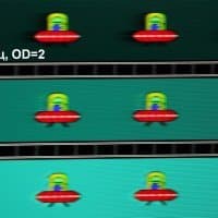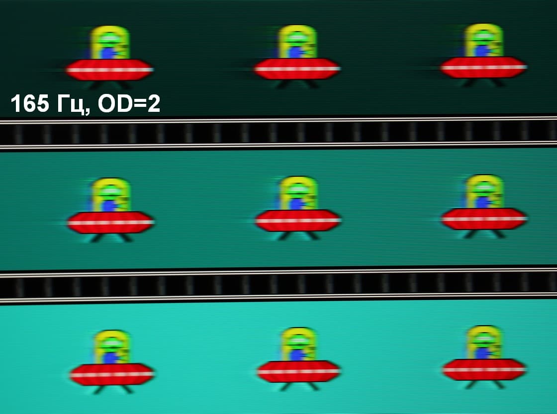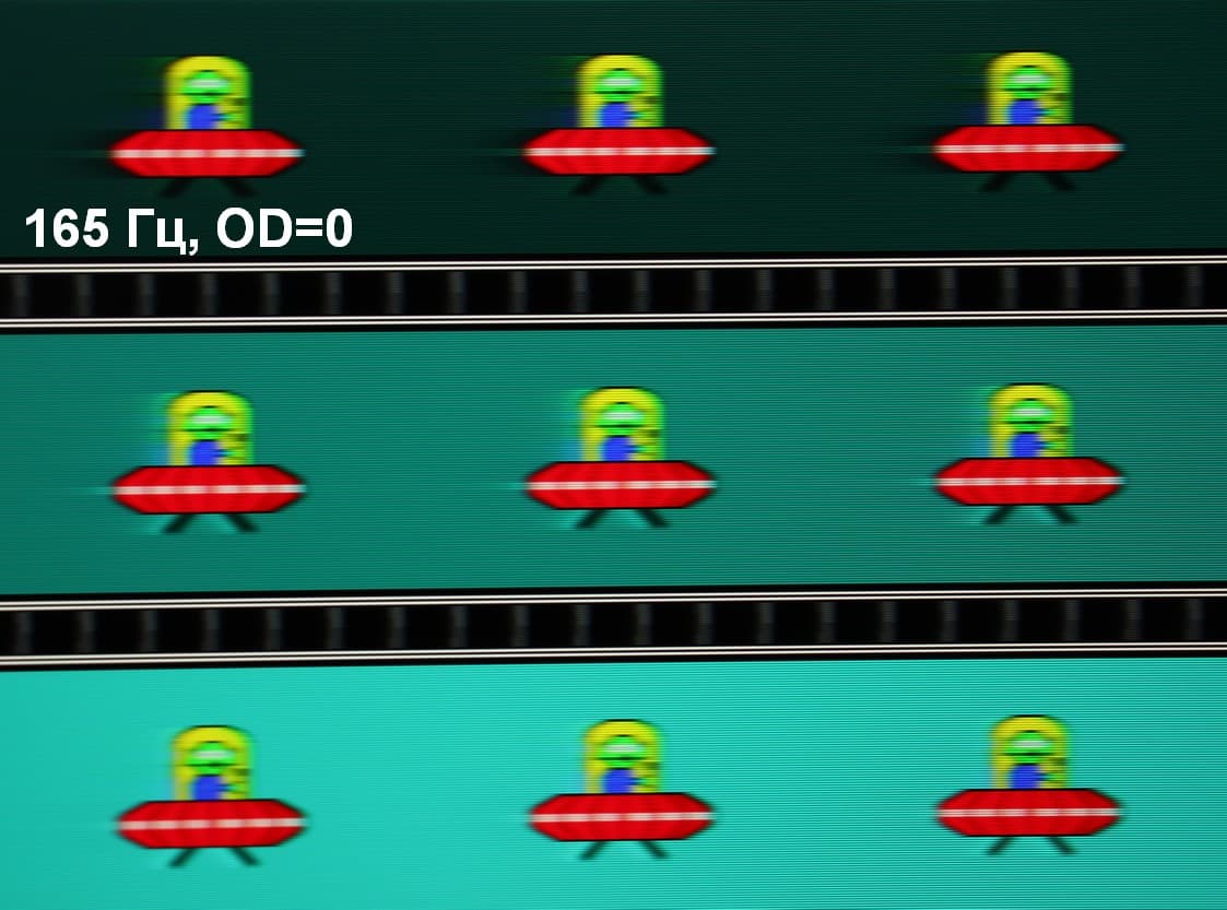 Для наглядного представления о том, что на практике означает такая скорость матрицы, и какие могут быть артефакты от разгона, приведем серию снимков, полученных с помощью движущейся камеры. Такие снимки показывают, что видит человек, если он следит глазами за двигающимся на экране объектом. Описание теста приведено тут, страница с самим тестом тут. Отметим, что получить хорошие по качеству снимки в этом тесте в случае изогнутого монитора сложно. Использовались рекомендованные установки (скорость движения 960 или 990 пиксель/с, то есть на целое число пикселей за кадр), выдержка 1/15 с, на фотографиях указаны значения частоты обновления, а также ступень разгона (сокращено до OD — от Overdrive) и включена ли функция вставки черного кадра (MPRT).