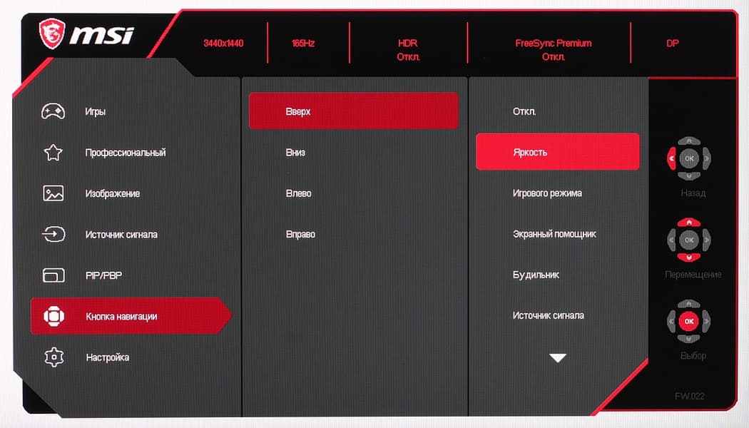 Индикатор питания неярко светится белым при работе, оранжевым — в режиме ожидания, и не горит, если монитор условно выключен. Если монитор работает, и на экране нет меню, то при отклонении джойстика вниз/вверх или вправо/влево на экран выводится та настройка, которая назначена на данное отклонение.