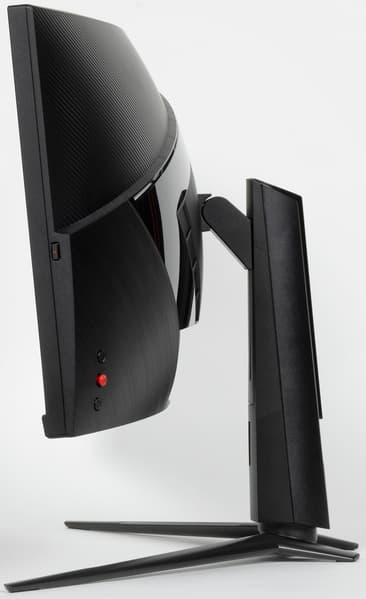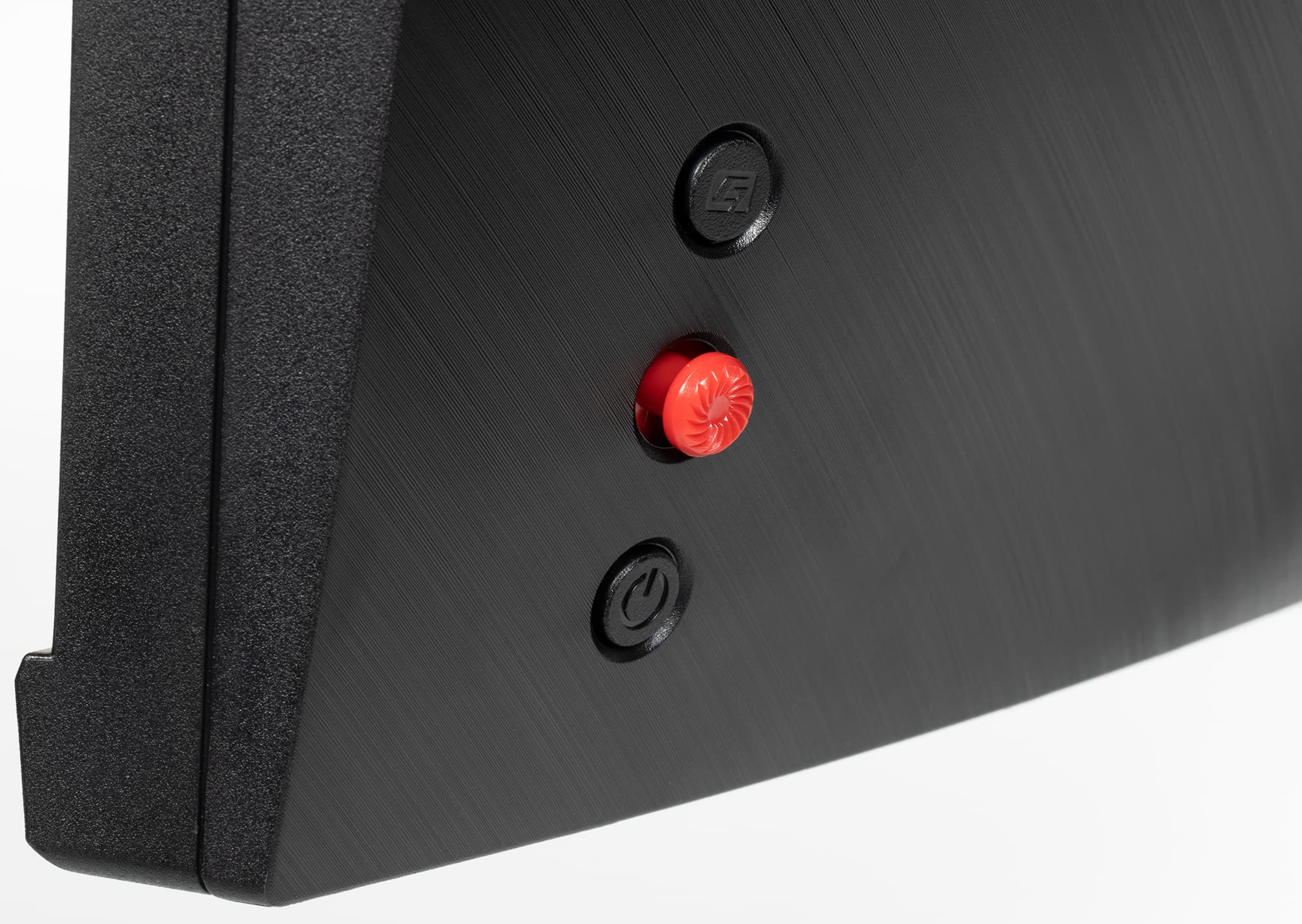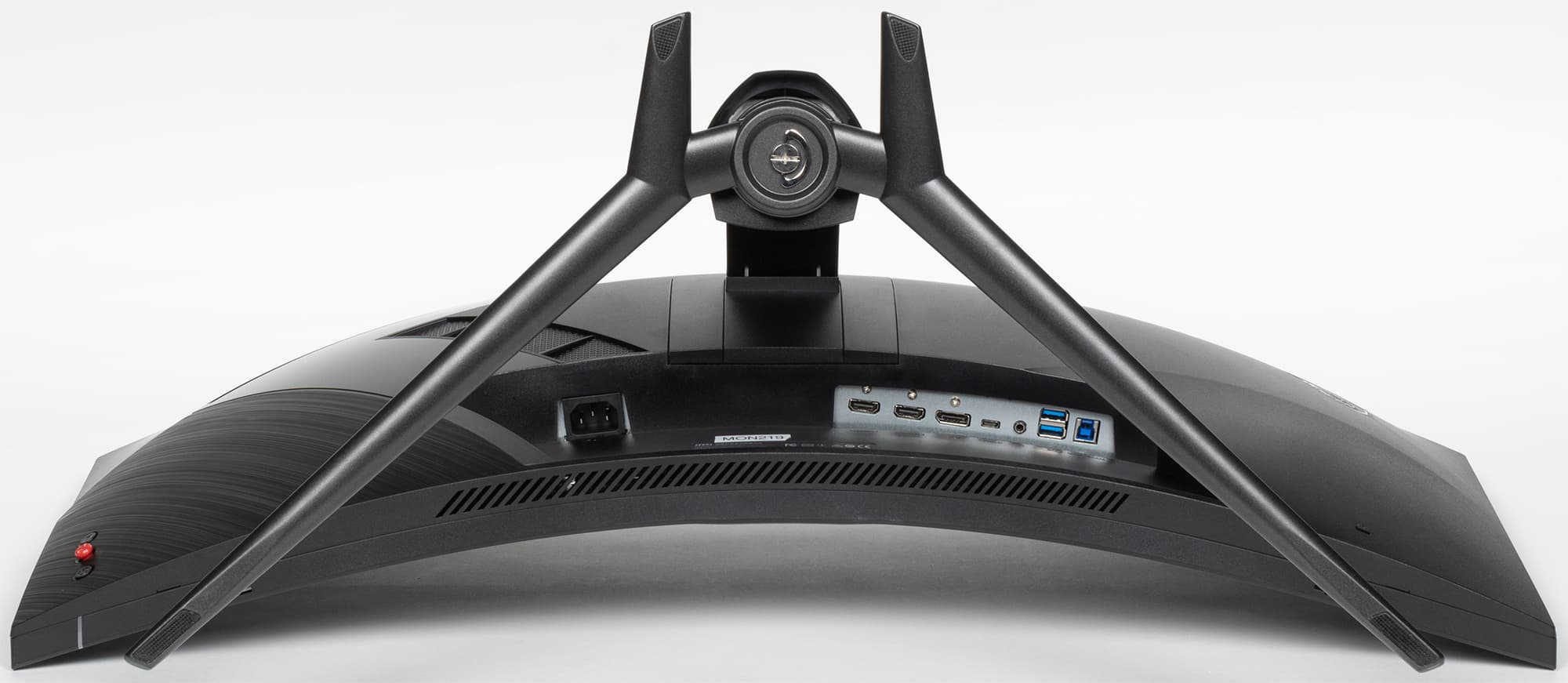 Дизайн сдержанно игровой. Корпус блока экрана, кожухи стойки и узла крепления блока экрана изготовлены из черного пластика в основном с матовой поверхностью, но местами есть мелкий рельефный узор и глянцевые участки. Ориентацию на игроков выдают четырехпалое основание подставки, изготовленное из алюминиевого сплава и имеющее стойкое матовое темно-темно-серо-серебристое покрытие, оформление задней панели и стойки подставки, а также красный цвет джойстика. Внешняя поверхность матрицы черная, полуматовая (зеркальность хорошо выражена), внешний слой матрицы жесткий. Плоскость экрана изогнута по цилиндру так, что правый и левый край немного выдвинуты вперед. Заявленный радиус изгиба равен 1 м. Равномерность кривизны экрана у данной модели хорошая, правда в вертикальной полосе шириной порядка 12 см у правого и левого края экран практически плоский, но это характерно для всех изогнутых ЖК-экранов. Спереди экран выглядит как монолитная поверхность, ограниченная снизу неширокой планкой, а по периметру — узкой окантовкой. Выведя изображение на экран, можно увидеть, что на самом деле между внешними границами экрана и собственно областью отображения есть неширокие поля.