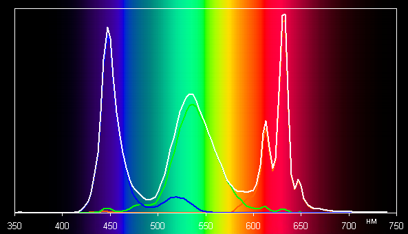 Ниже приведен спектр для белого поля (белая линия), наложенный на спектры красного, зеленого и синего полей (линии соответствующих цветов):