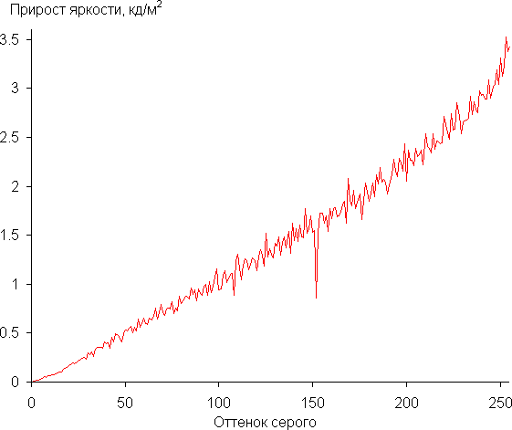 Для оценки характера роста яркости на шкале серого мы измерили яркость 256 оттенков серого (от 0, 0, 0 до 255, 255, 255). График ниже показывает прирост (не абсолютное значение!) яркости между соседними полутонами: