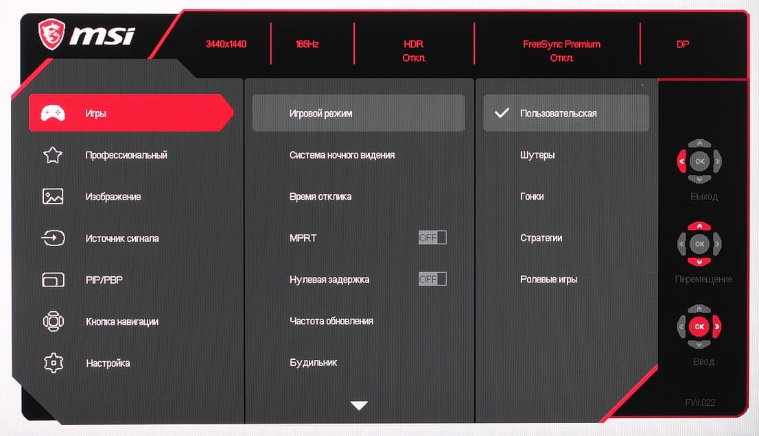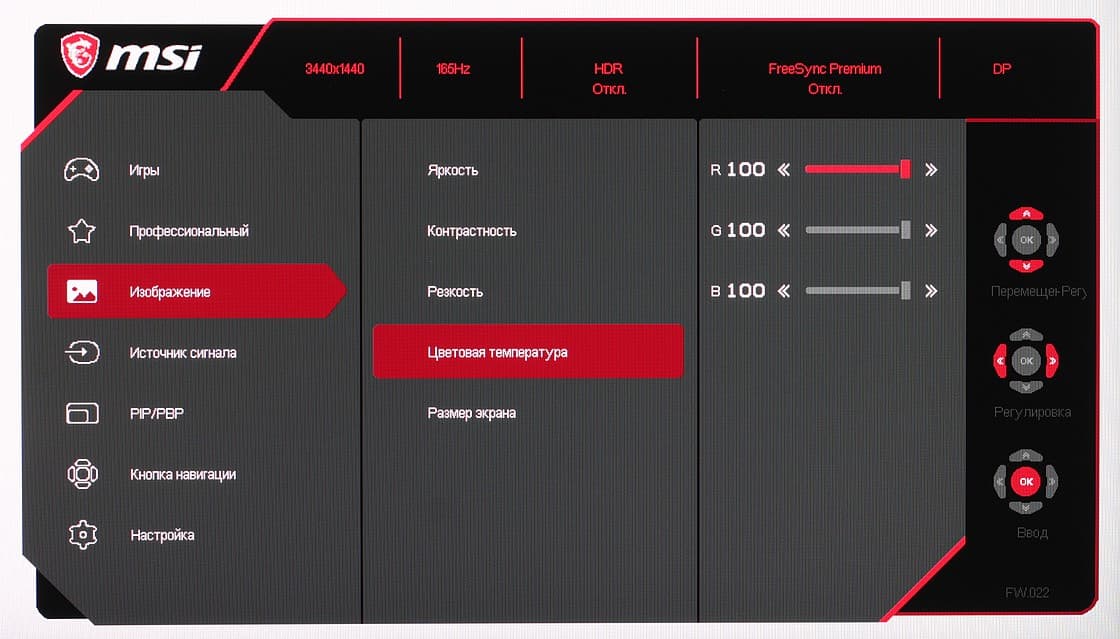 Настроек, влияющих на яркостный и цветовой баланс, не очень много, что для игрового монитора ожидаемо. Есть регулировки яркости (подсветки) и контрастности, краевой четкости (Резкость), подстрока различимости градаций в тенях, функции принудительного снижения интенсивности синей компоненты, включения динамической регулировки яркости подсветки и некая функция Улучшение изображения (ее заметный эффект — это агрессивное увеличение краевой четкости).