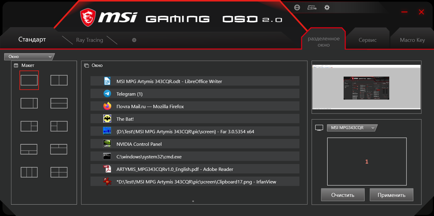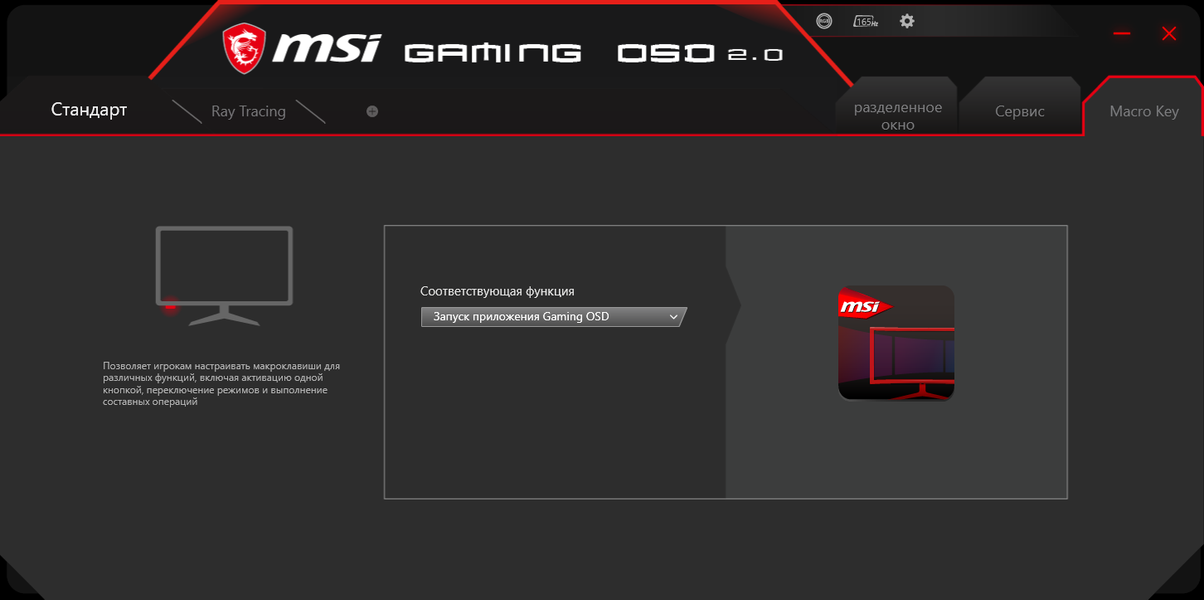На сайте производителя в разделе поддержки для этого монитора мы обнаружили ссылки на руководство (на русском есть), на драйвер, на список характеристик в виде файла PDF и на ПО GamingOSD, с помощью которого монитором можно управлять с ПК (нужно подключение к порту USB-B на мониторе). Кроме настроек, доступных из меню монитора, в OSD Sidekick можно сохранять/загружать профили, управлять распределением окон на рабочем столе, изменять ряд системных настроек, задавать функцию, выполняемую при нажатии на макро-кнопку, устанавливать клавиатурные сокращения для оперативного изменения ряда настроек монитора, и вызывать утилиту Mystic Light, предназначенную для настройки декоративной подсветки на задней панели монитора.