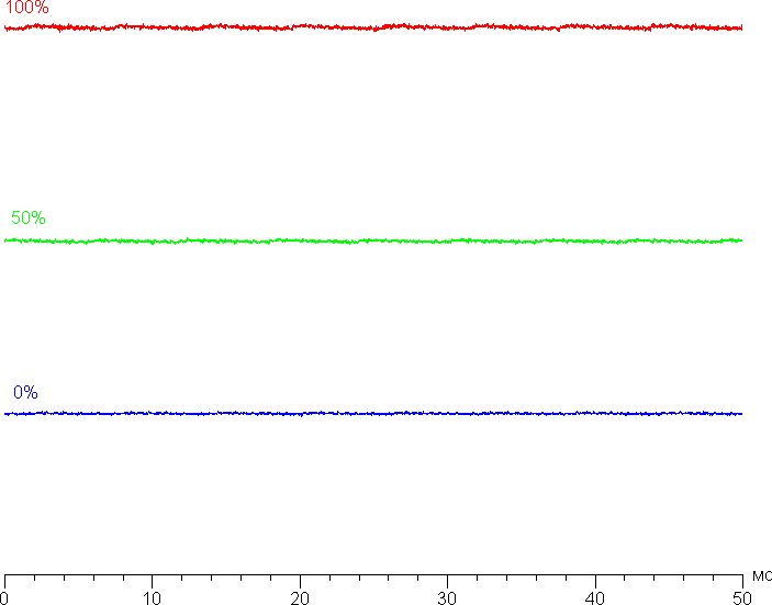 На любом уровне яркости модуляция подсветки отсутствует, что исключает видимое мерцание экрана. Для тех, кто привык распознавать знакомое сокращение, уточним: ШИМ отсутствует. В доказательство приведем графики зависимости яркости (вертикальная ось) от времени (горизонтальная ось) при различных значениях настройки яркости:
