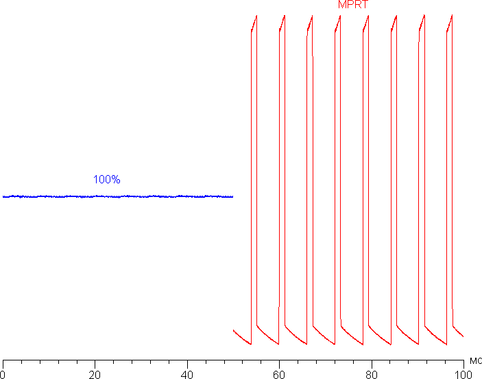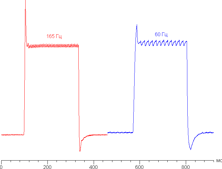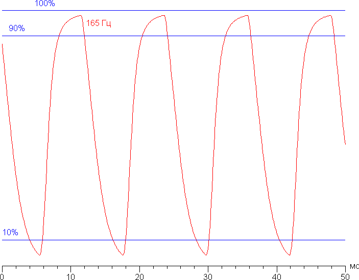 Приведем зависимости яркости (вертикальная ось) от времени (горизонтальная ось) при чередовании белого и черного кадра при 165 Гц кадровой частоты: