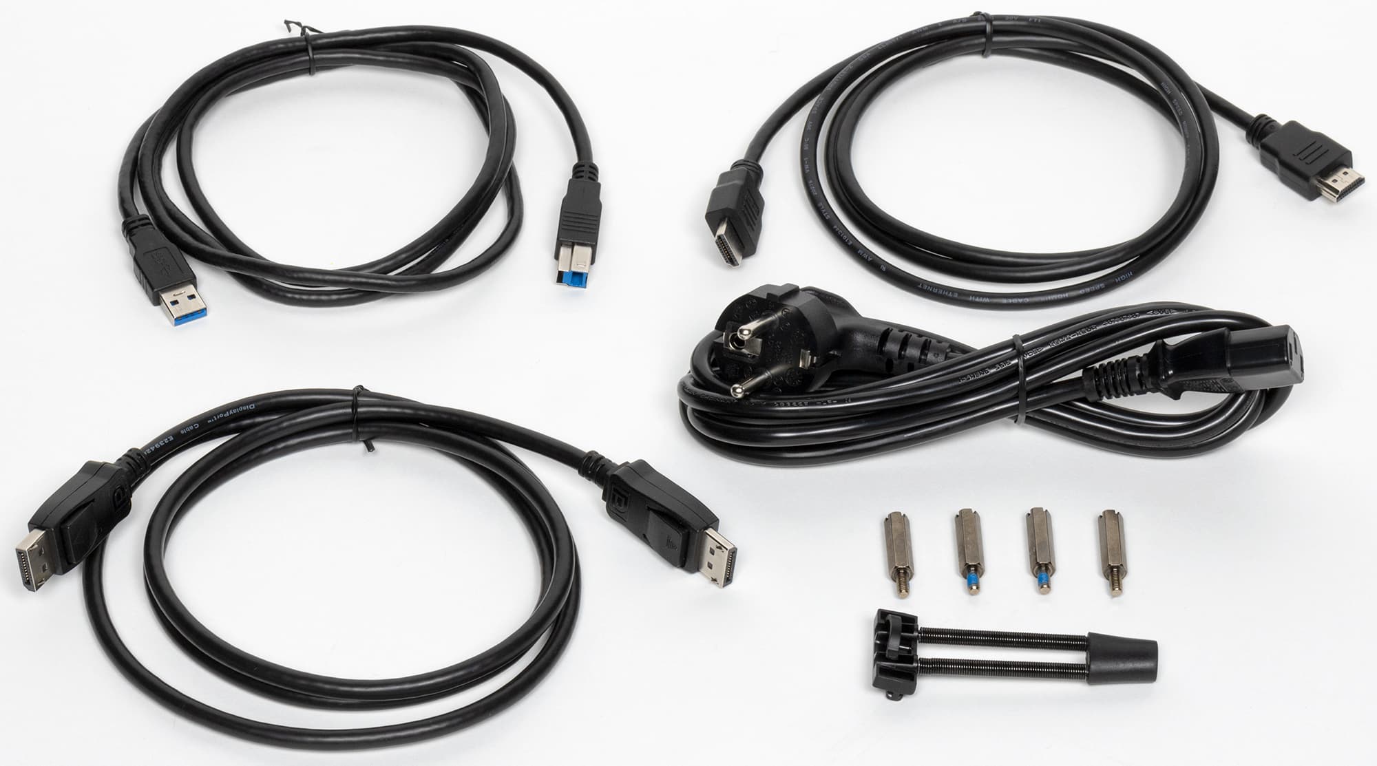 В комплект поставки входят три интерфейсных кабеля — HDMI, DisplayPort и USB A-B.