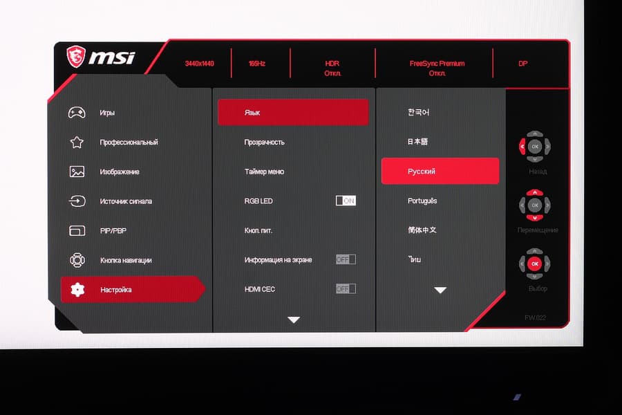 Только при подключении к компьютеру по DisplayPort (и USB-C) поддерживается разрешение до 3440×1440 при 165 Гц кадровой частоты в режиме 8 бит на цвет на вход и без потери цветовой четкости. Снижение частоты до 144 Гц позволяет увеличить разрядность до 10 бит на цвет. При подключении по HDMI в разрешении 3440×1440 можно получить максимум 100 Гц кадровой частоты при 8 бит на цвет (и 12 бит при 50 Гц). Отметим, что пр подключении по DisplayPort (и, видимо, USB-C) и по HDMI на вход поддерживается сигнал 4К@60p (3840×2160), а также 1080@120p, что обеспечивает лучшую совместимость с приставками (игровыми консолями).