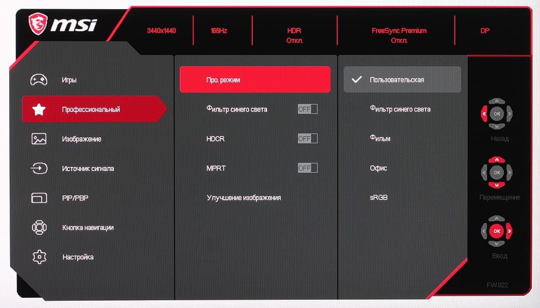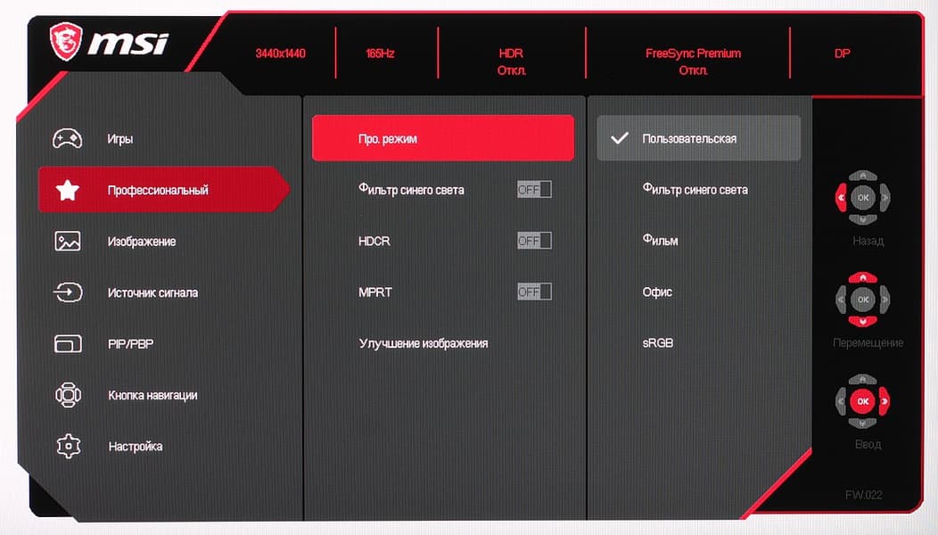 Можно корректировать цветовой баланс выбором цветового профиля из трех предустановленных или пользовательского, в котором цветовой баланс можно подправить регулировками интенсивности трех основных цветов. Можно выбрать один из четырех предустановленных профилей с заданными «игровыми» настройками и одновременно с этим один из четырех с «профессиональными» настройками изображения. В обоих списках профилей есть еще по одному пользовательскому профилю. Все профили являются редактируемыми.