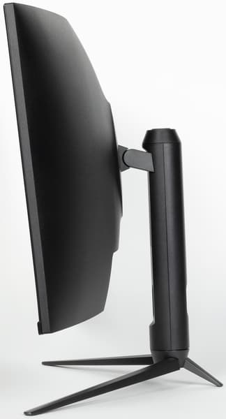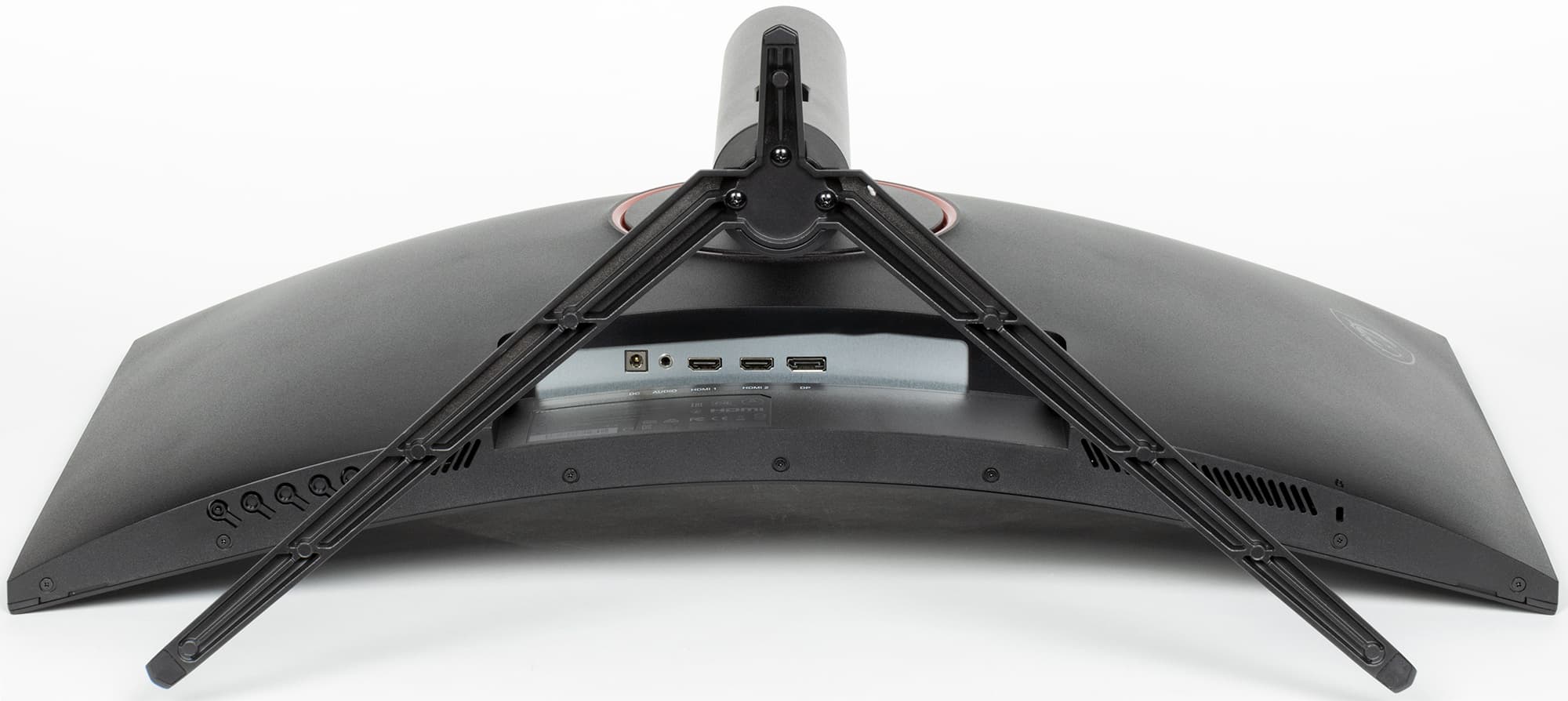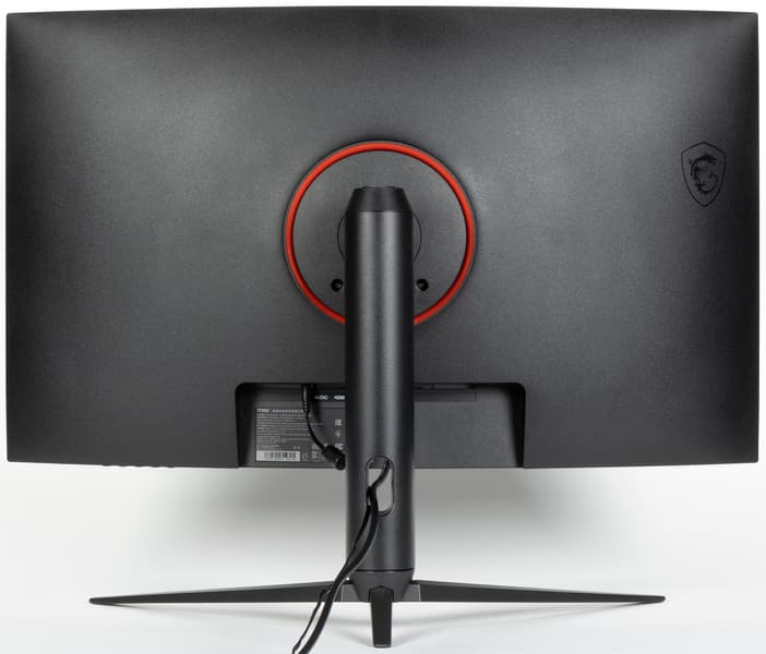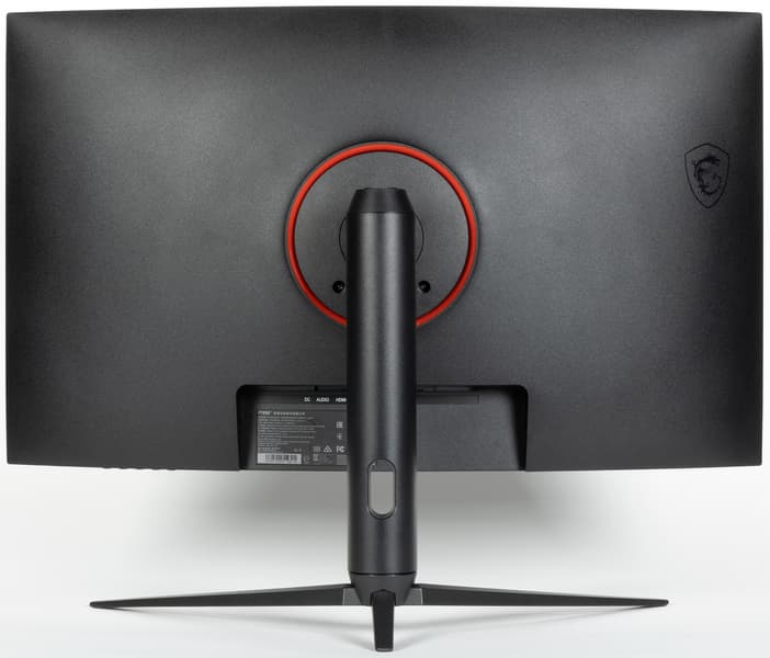 Дизайн сдержанно игровой. Корпус блока экрана, кожухи стойки и узла крепления блока экрана изготовлены из черного пластика с матовой поверхностью. Ориентацию на игроков выдают трехпалое основание подставки, изготовленное из алюминиевого сплава и имеющее стойкое матовое черное покрытие, а также красный цвет круглой пластиковой вставки вокруг крепления подставки на задней панели. Внешняя поверхность матрицы черная, полуматовая (зеркальность хорошо выражена), внешний слой матрицы жесткий. Плоскость экрана изогнута по цилиндру так, что правый и левый край немного выдвинуты вперед. Заявленный радиус изгиба равен 1 м. Равномерность кривизны экрана у данной модели хорошая. Правда, в вертикальной полосе шириной порядка 10 см у правого и левого края экран практически плоский, но это характерно для всех изогнутых ЖК-экранов. Спереди экран выглядит как монолитная поверхность, ограниченная снизу неширокой планкой, а по периметру — узкой окантовкой (такой дизайн называют безрамочным). Выведя изображение на экран, можно увидеть, что на самом деле между внешними границами экрана и собственно областью отображения есть неширокие поля.