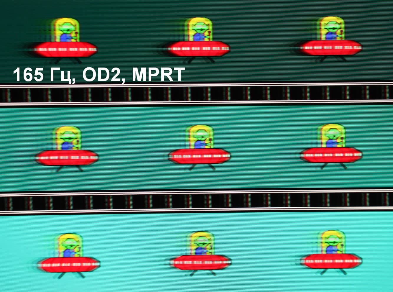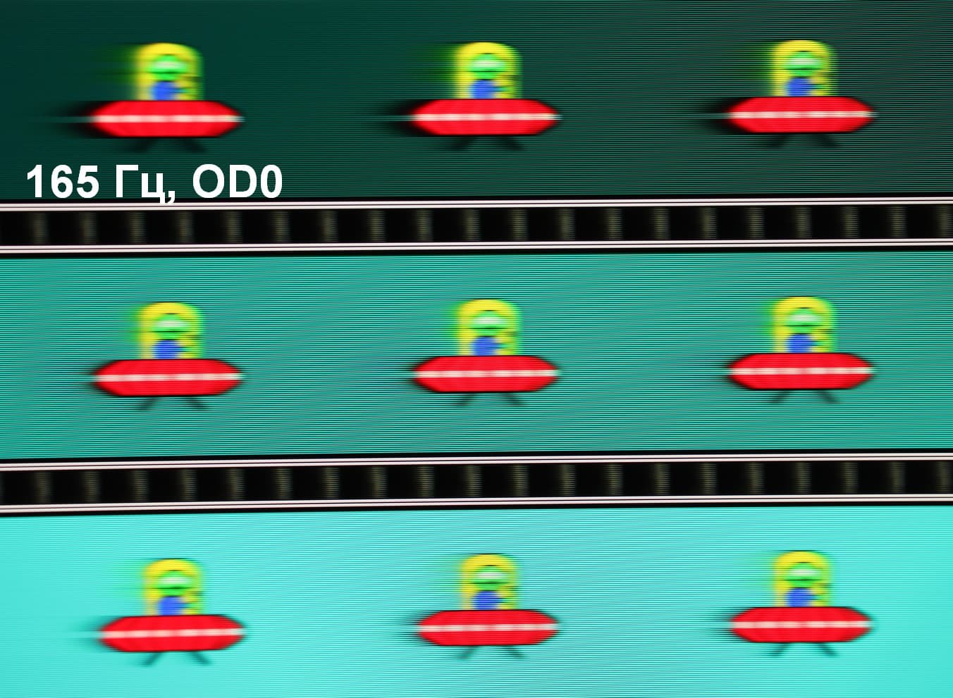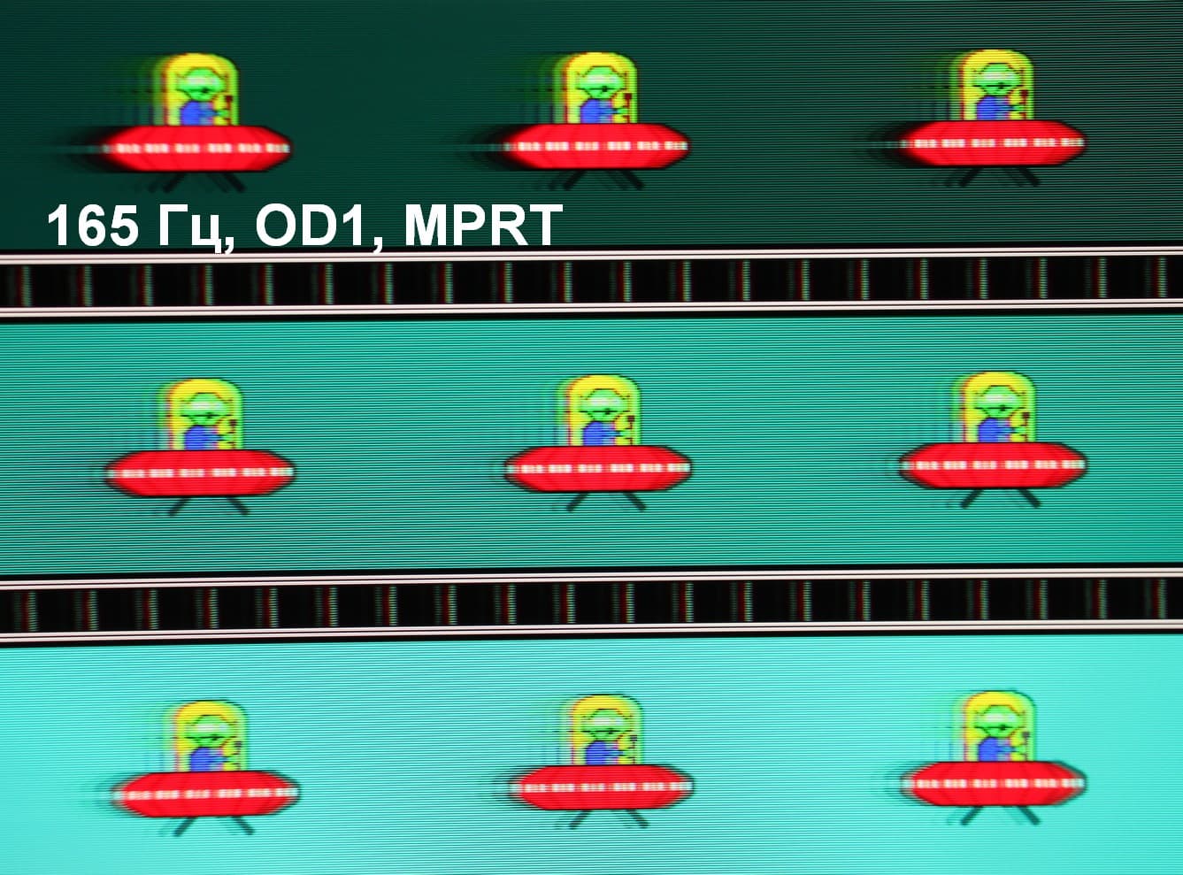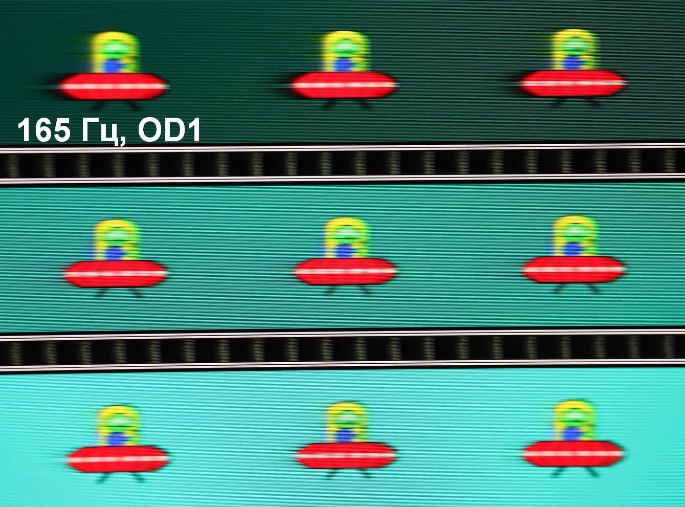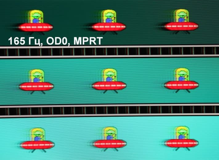 Для наглядного представления о том, что на практике означает такая скорость матрицы, и какие могут быть артефакты от разгона, приведем серию снимков, полученных с помощью движущейся камеры. Такие снимки показывают, что видит человек, если он следит глазами за двигающимся на экране объектом. Описание теста приведено тут, страница с самим тестом тут. Отметим, что получить хорошие по качеству снимки в этом тесте в случае изогнутого монитора сложно. Использовались рекомендованные установки (скорость движения 960 или 990 пиксель/с, то есть на целое число пикселей за кадр), выдержка 1/15 с, на фотографиях указаны значения частоты обновления, а также ступень разгона (сокращено до OD — от Overdrive) и включена ли функция вставки черного кадра (MPRT).
