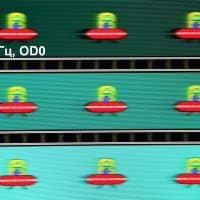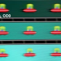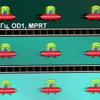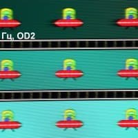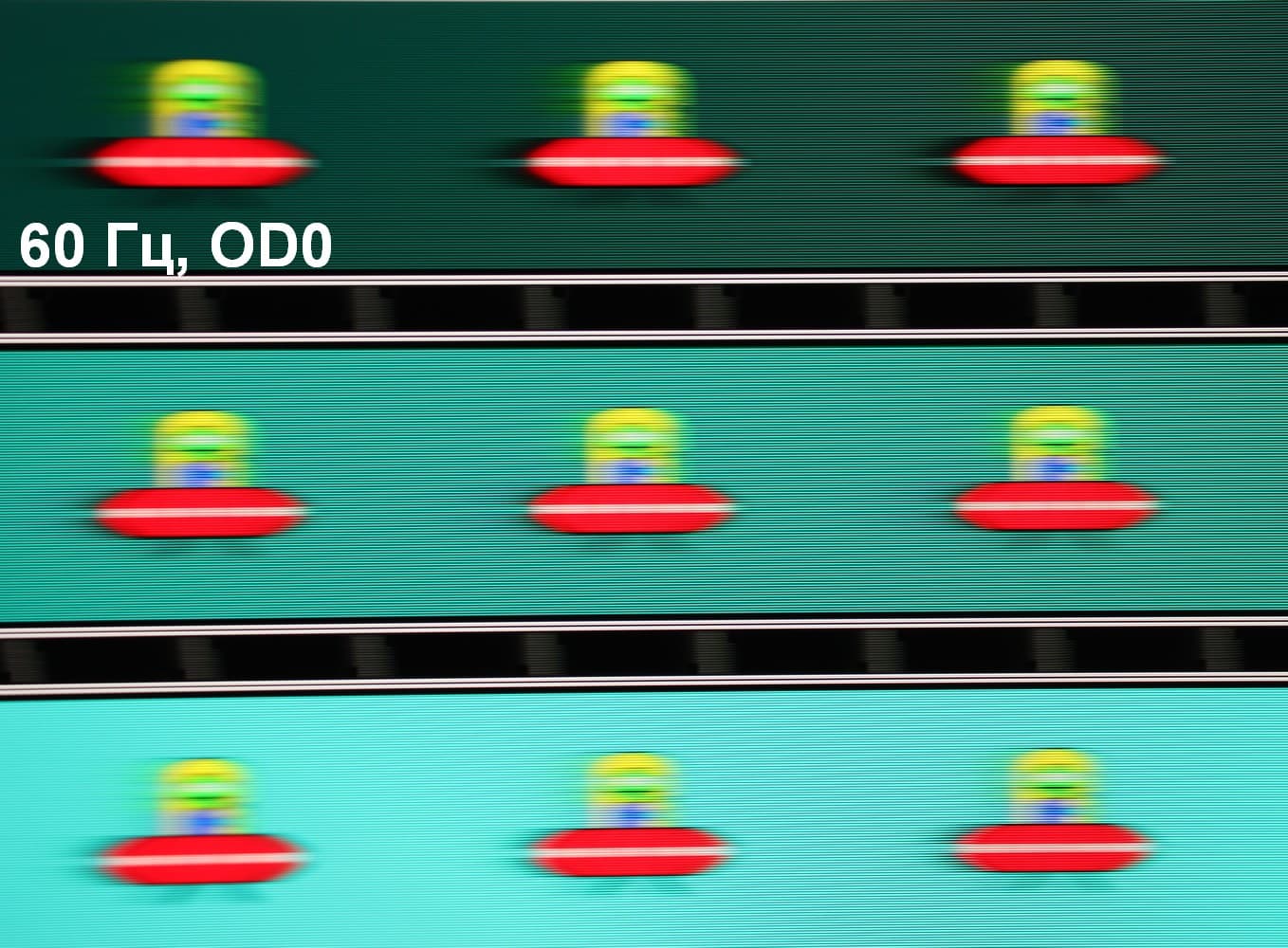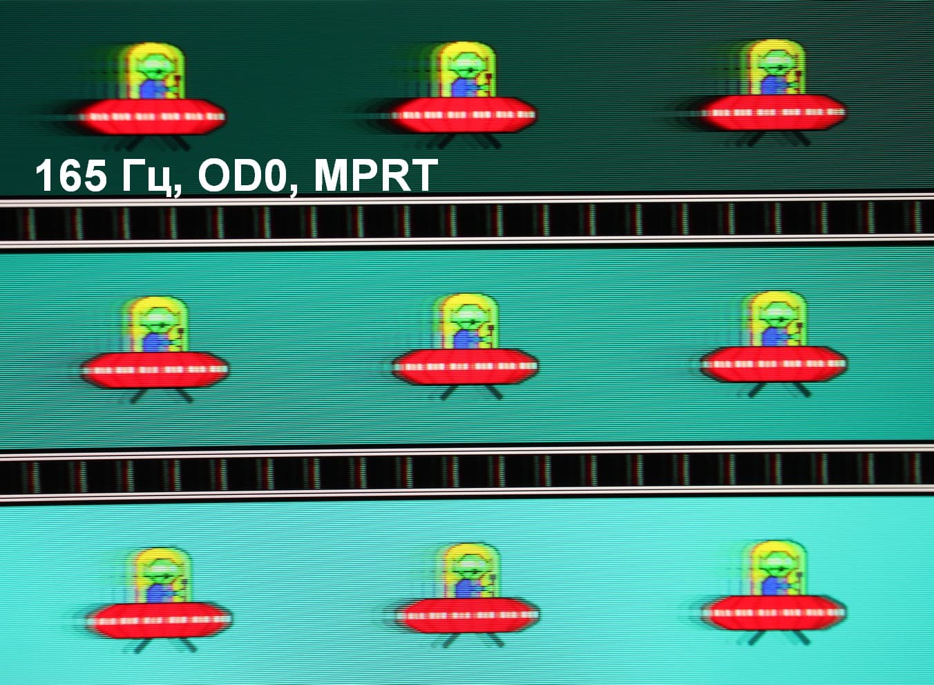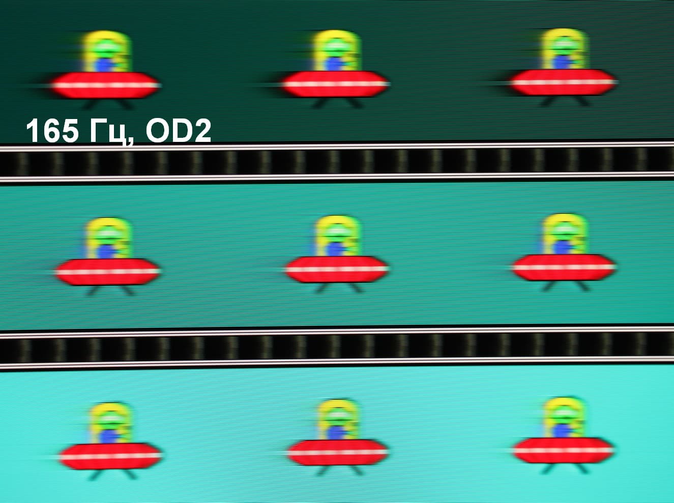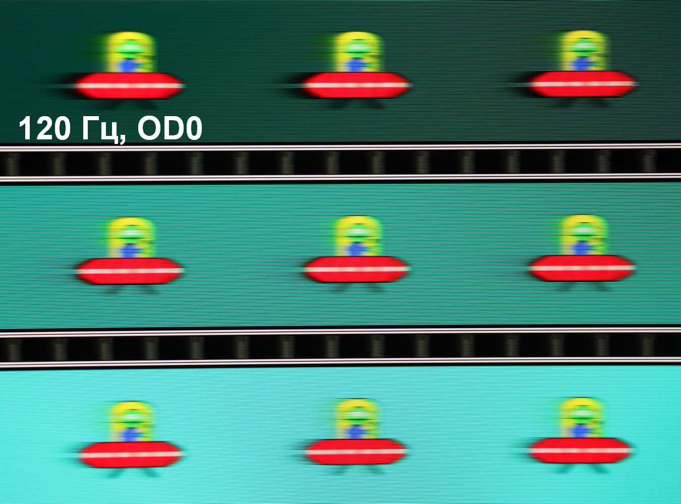 Для наглядного представления о том, что на практике означает такая скорость матрицы, и какие могут быть артефакты от разгона, приведем серию снимков, полученных с помощью движущейся камеры. Такие снимки показывают, что видит человек, если он следит глазами за двигающимся на экране объектом. Описание теста приведено тут, страница с самим тестом тут. Отметим, что получить хорошие по качеству снимки в этом тесте в случае изогнутого монитора сложно. Использовались рекомендованные установки (скорость движения 960 или 990 пиксель/с, то есть на целое число пикселей за кадр), выдержка 1/15 с, на фотографиях указаны значения частоты обновления, а также ступень разгона (сокращено до OD — от Overdrive) и включена ли функция вставки черного кадра (MPRT).