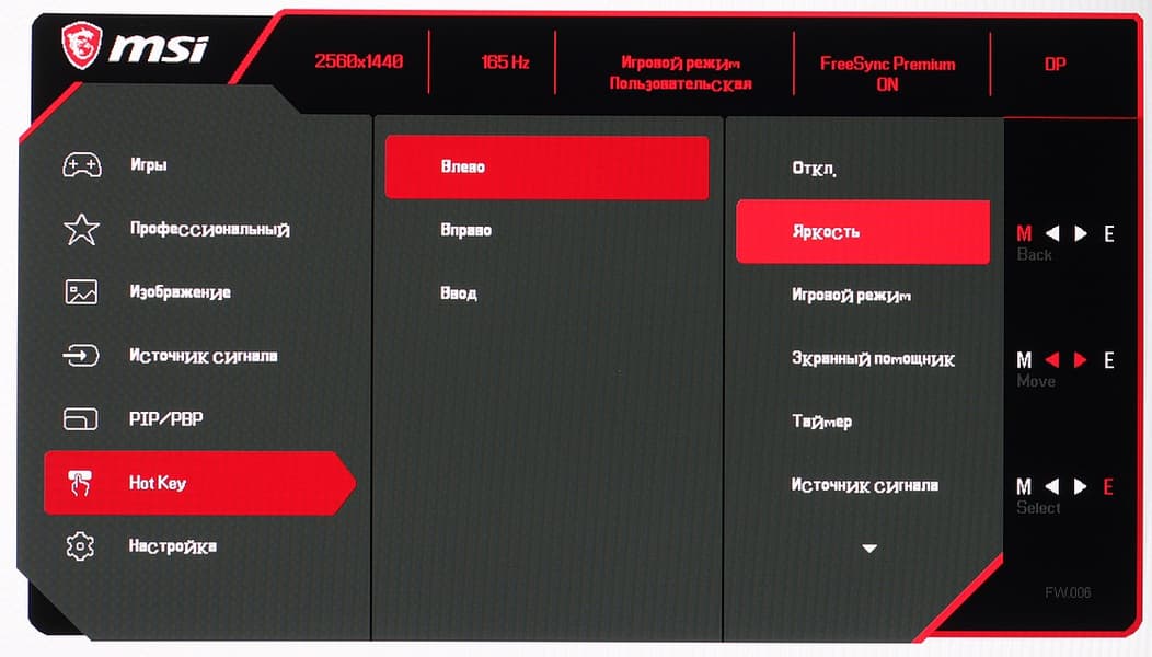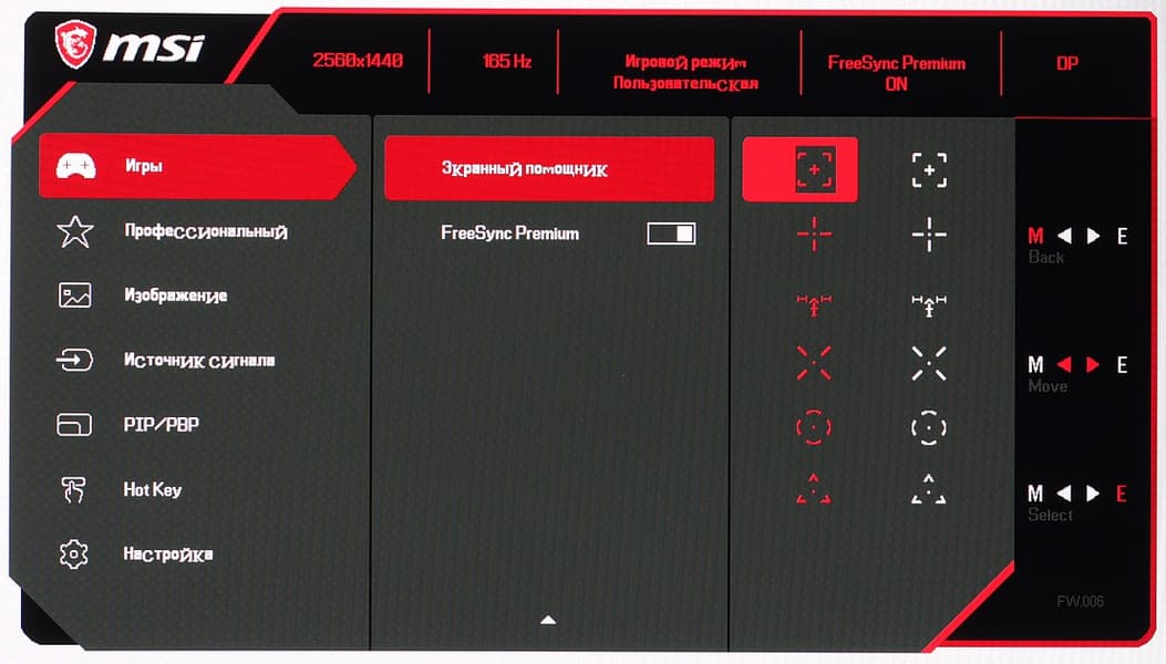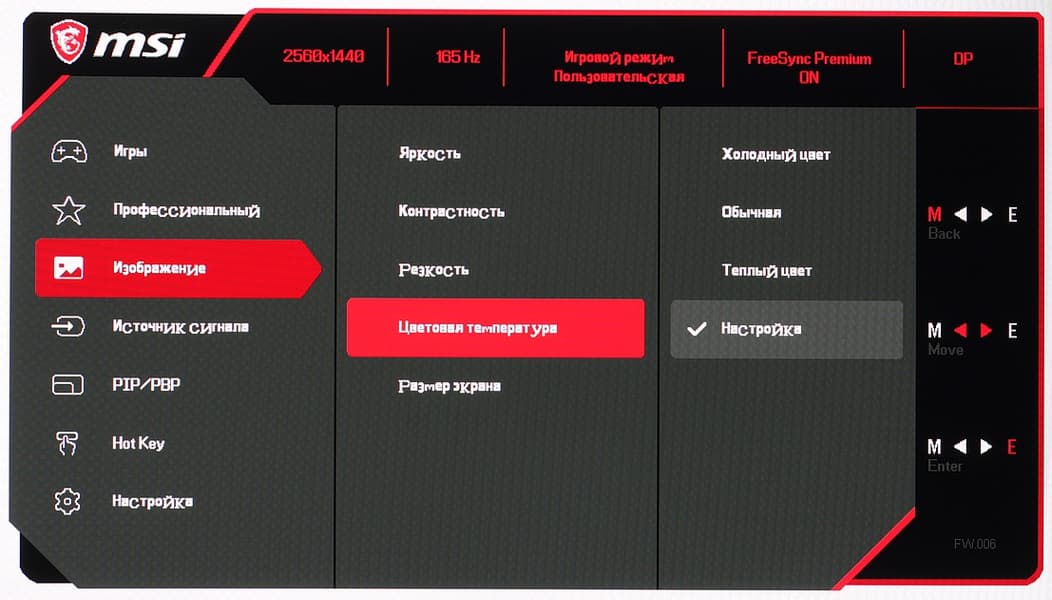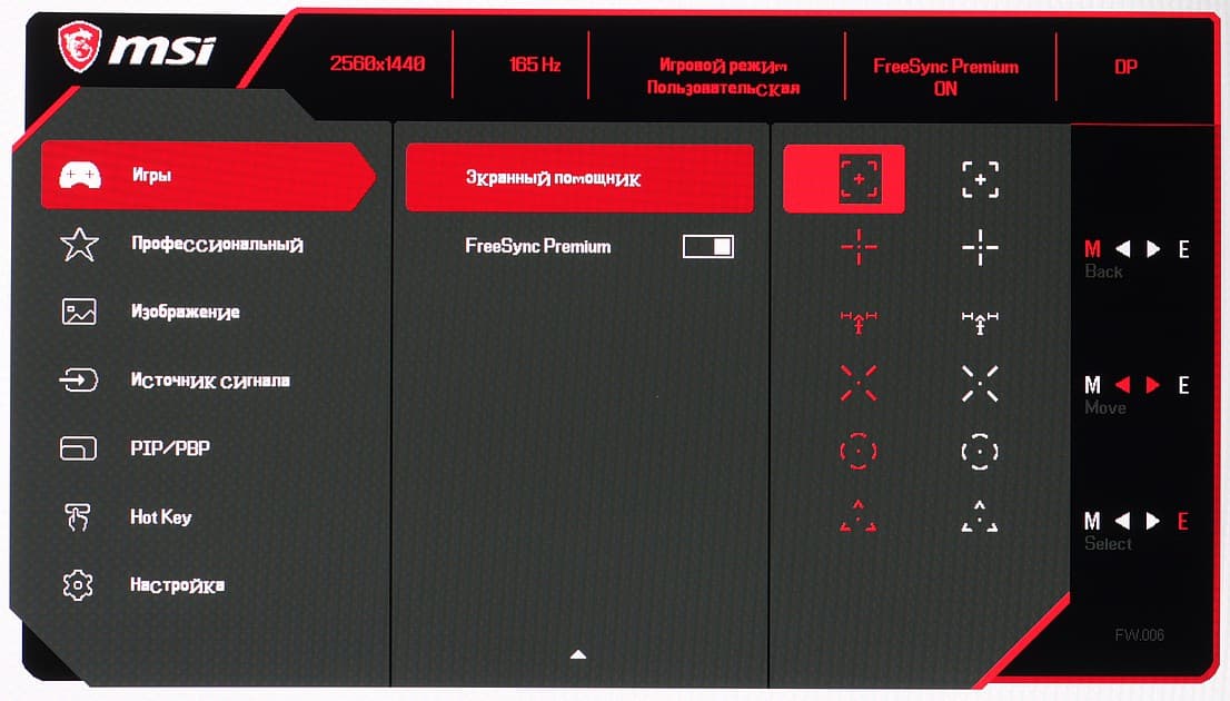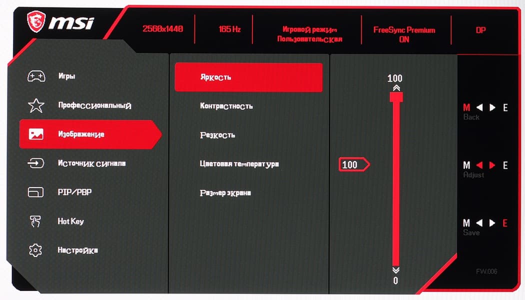 Настроек, влияющих на яркостный и цветовой баланс, не очень много, что для игрового монитора ожидаемо. Есть регулировки яркости (подсветки) и контрастности, краевой четкости (Резкость), подстрока различимости градаций в тенях, функции принудительного снижения интенсивности синей компоненты, включения динамической регулировки яркости подсветки и некая функция Улучшение изображения (ее заметный эффект — это агрессивное увеличение краевой четкости).